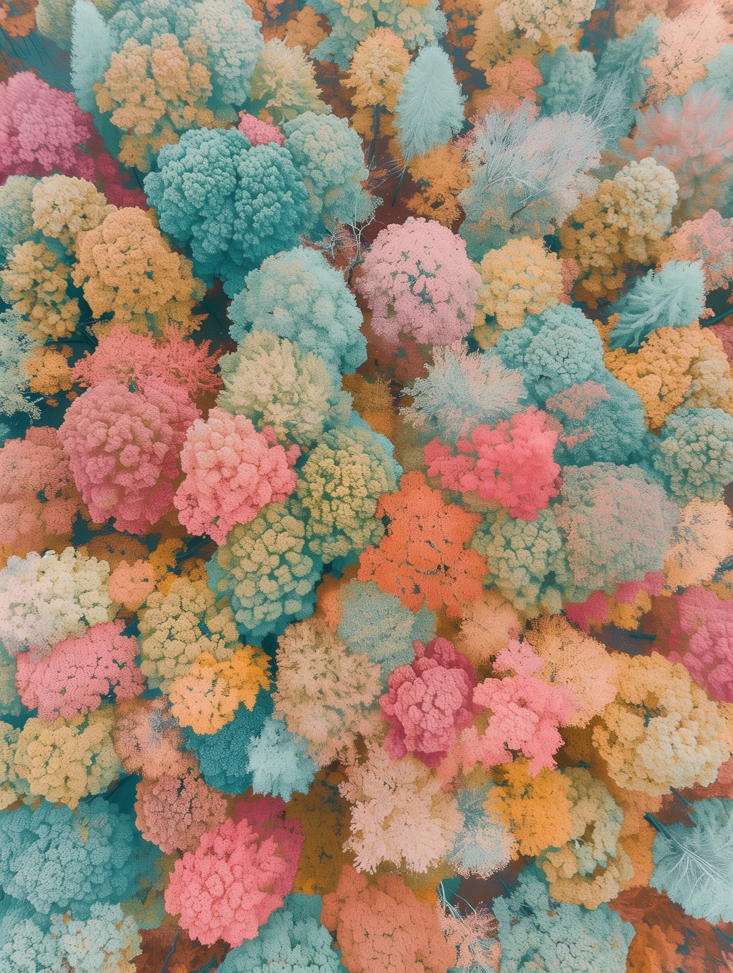 A surreal aerial view of a forest with pastel-colored trees in pink, teal, orange, and yellow, creating a dreamy and artistic landscape.