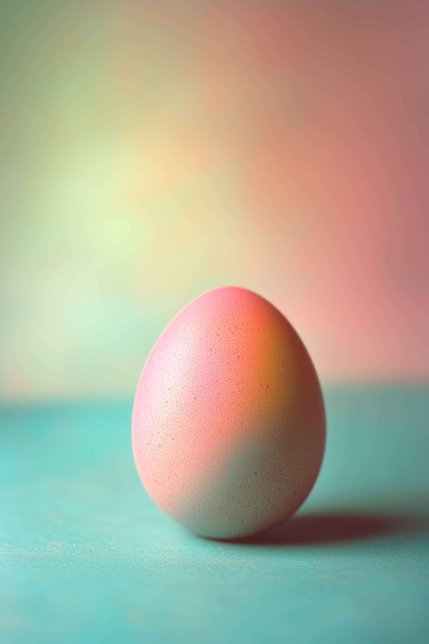 A pastel-colored egg with a speckled texture on a turquoise surface, set against a dreamy blurred background of soft hues.
