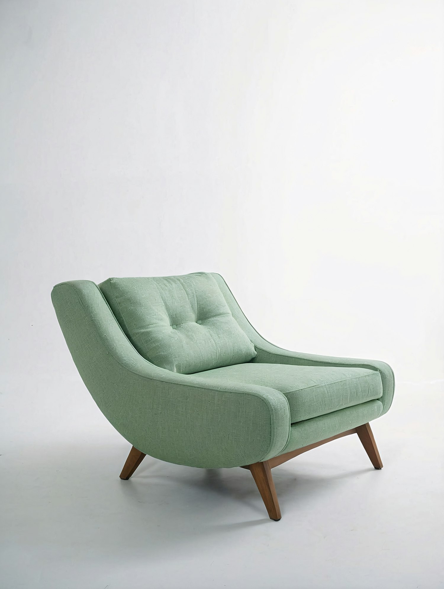 Stylish pastel green armchair with tufted backrest and angled wooden legs, perfect for a modern or mid-century inspired space.