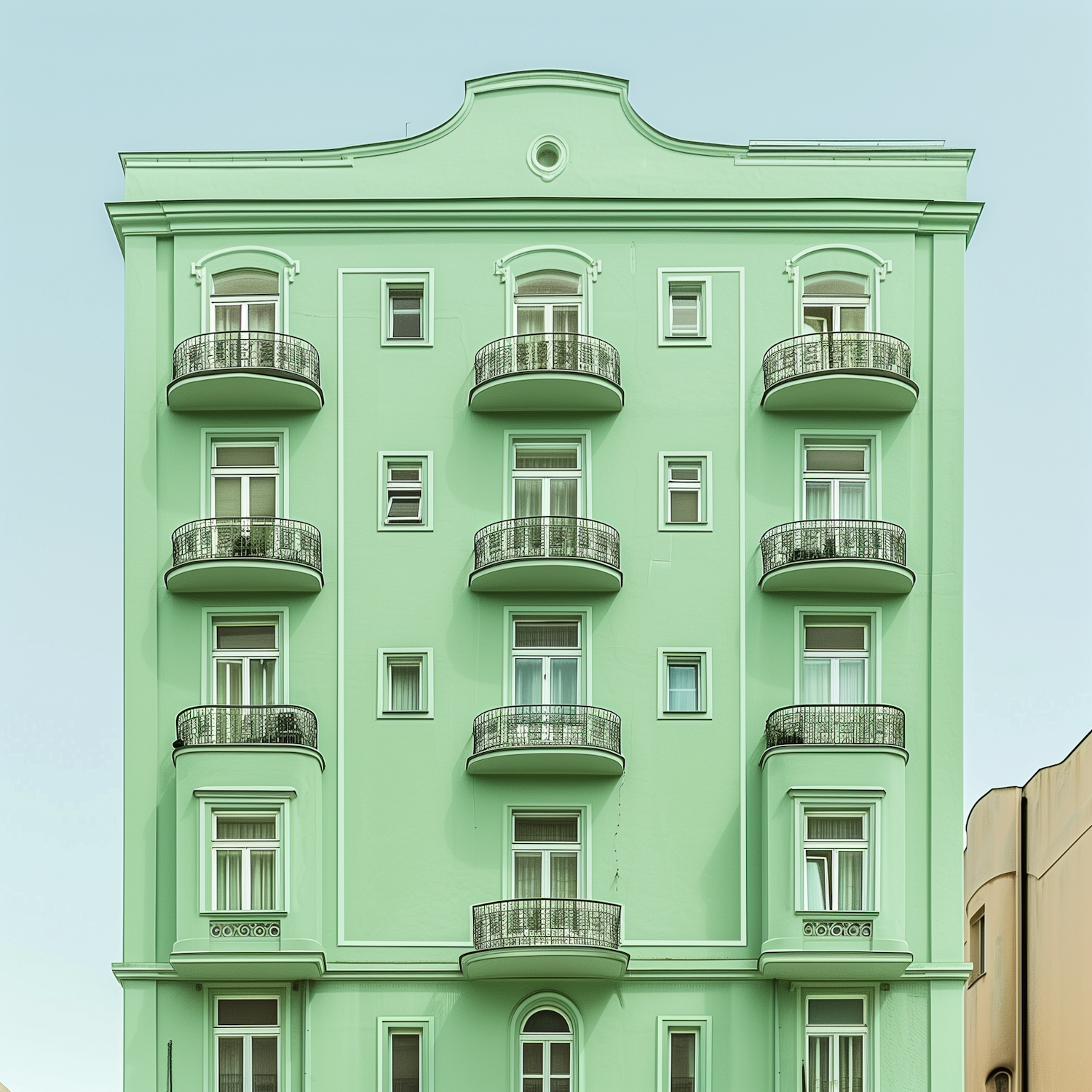 Pastel green building with ornate balconies and arched windows against a clear blue sky.