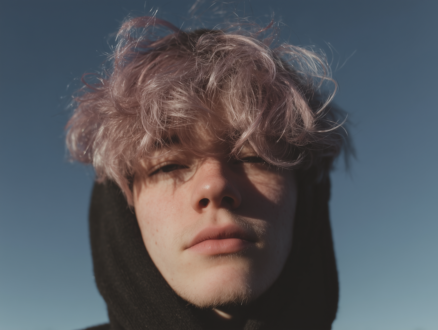 Close-up portrait of a young person with pastel hair and a black hoodie against a clear blue sky, showcasing natural light and soft shadows.