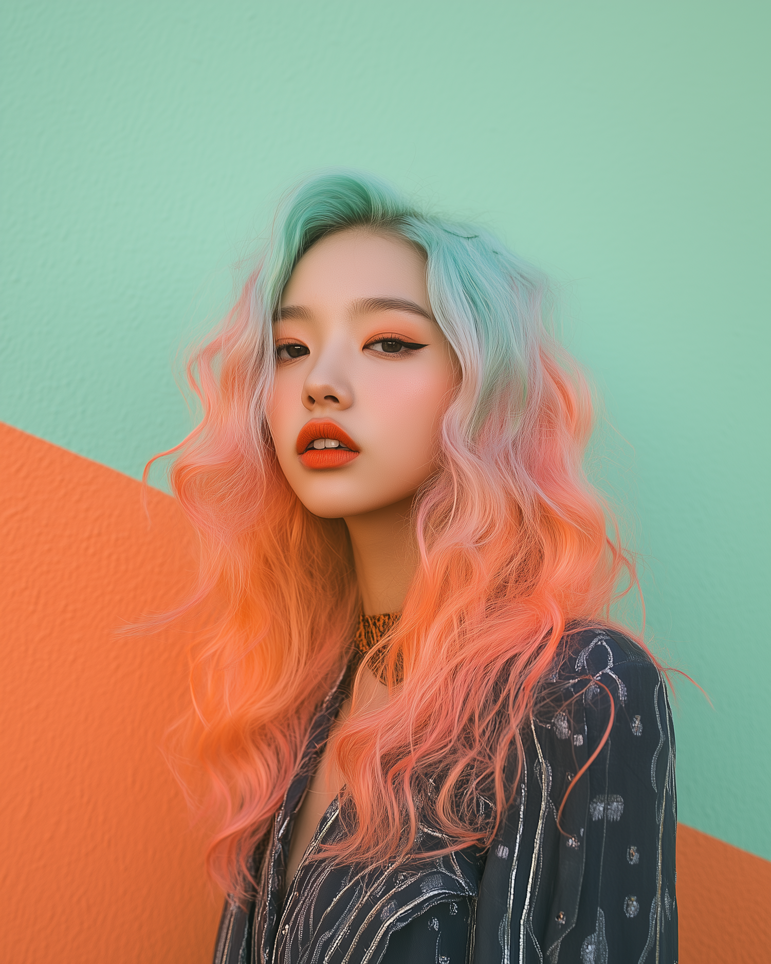 Vibrant portrait of a young woman with pastel hair and bold makeup against a colorful background.