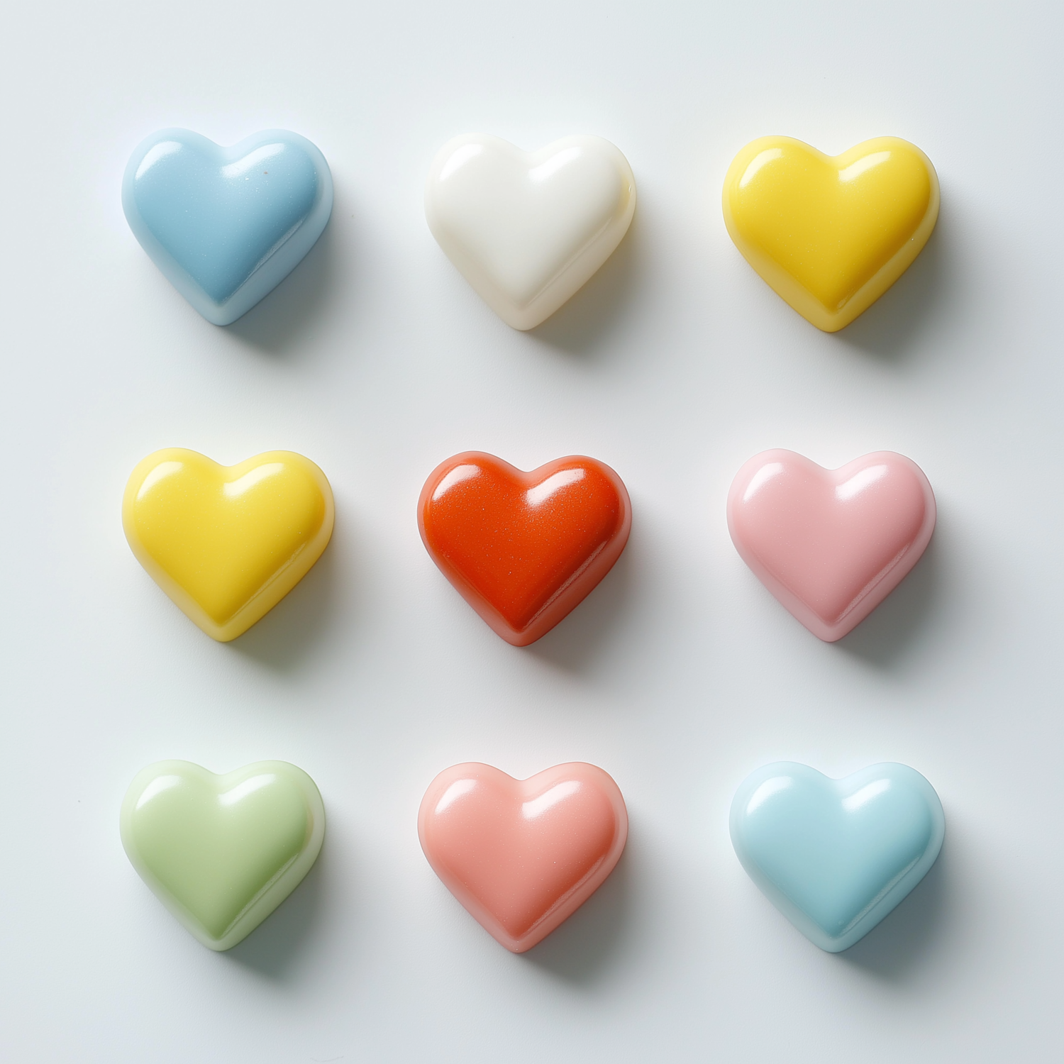 A grid of nine pastel-colored, glossy heart shapes on a white background, arranged symmetrically in three rows and columns.