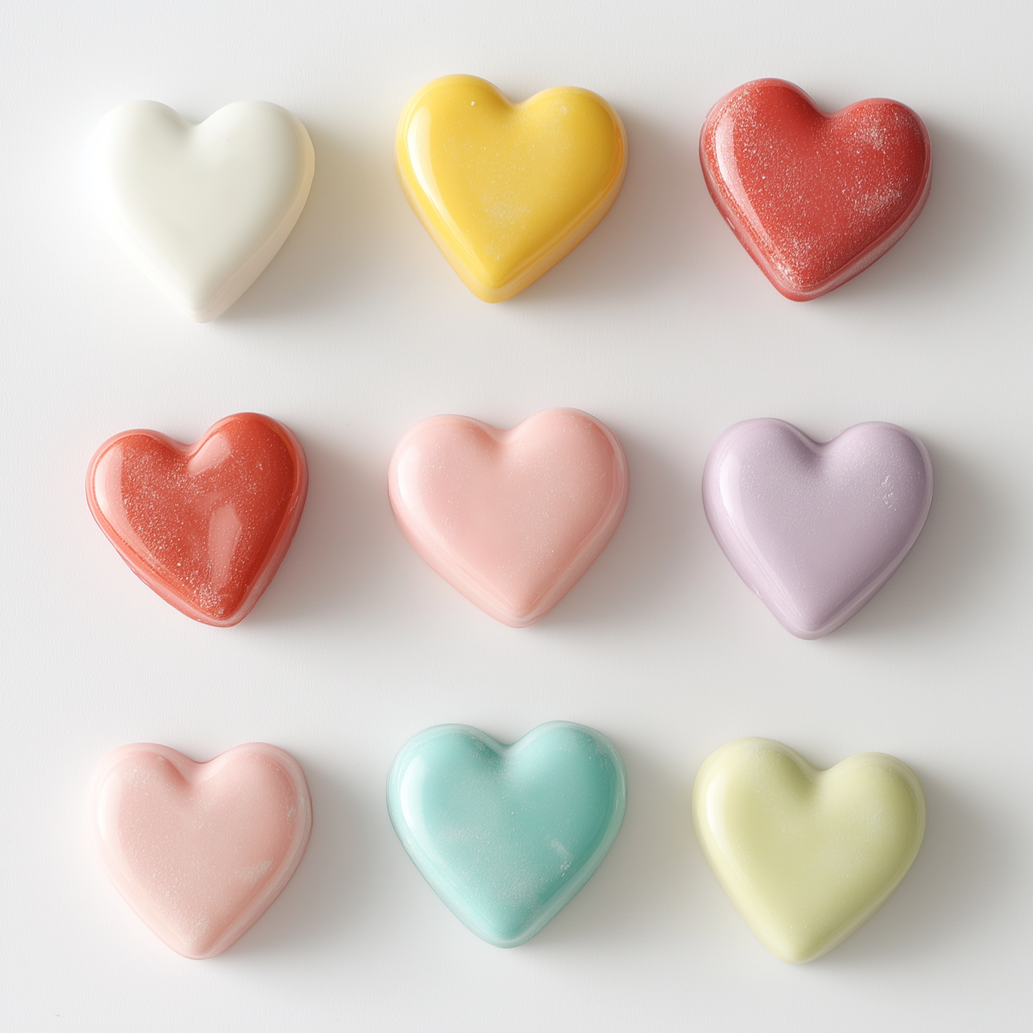 A grid of glossy pastel heart shapes in various colors like pink, yellow, and mint green, arranged on a white background.