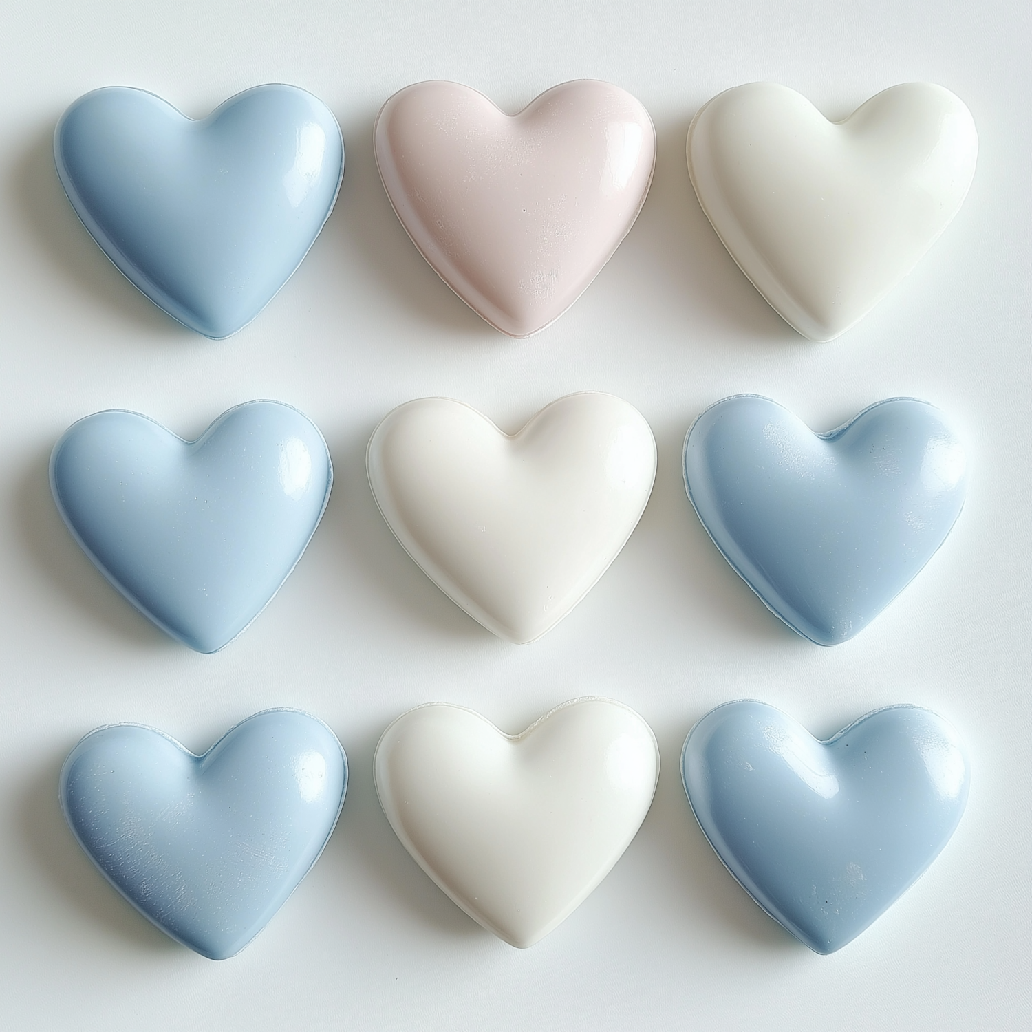 A grid of pastel heart-shaped objects in light blue, white, and pink on a clean white background. Perfect for minimalistic decor ideas.