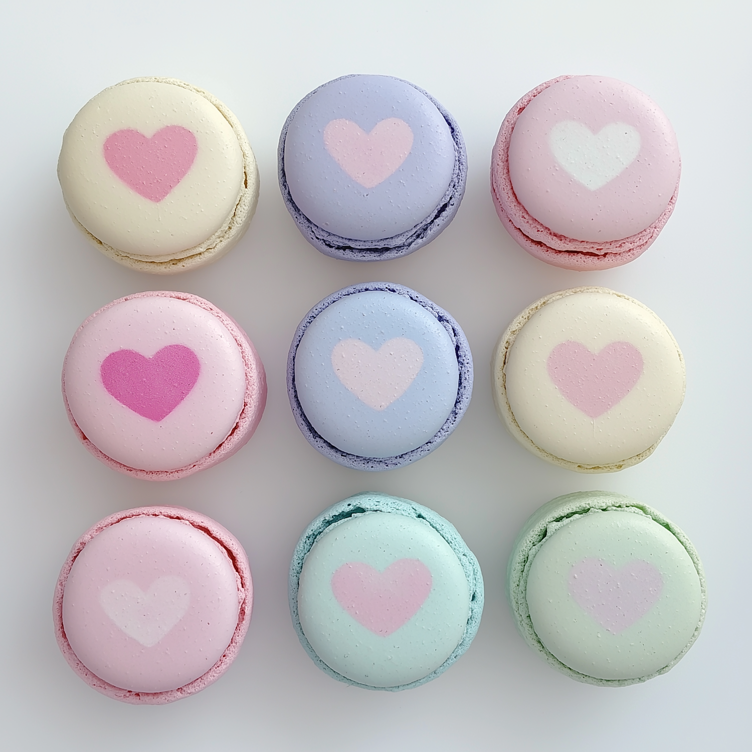 A grid of pastel macarons with heart designs in soft shades of pink, lavender, mint, and cream on a clean white background.