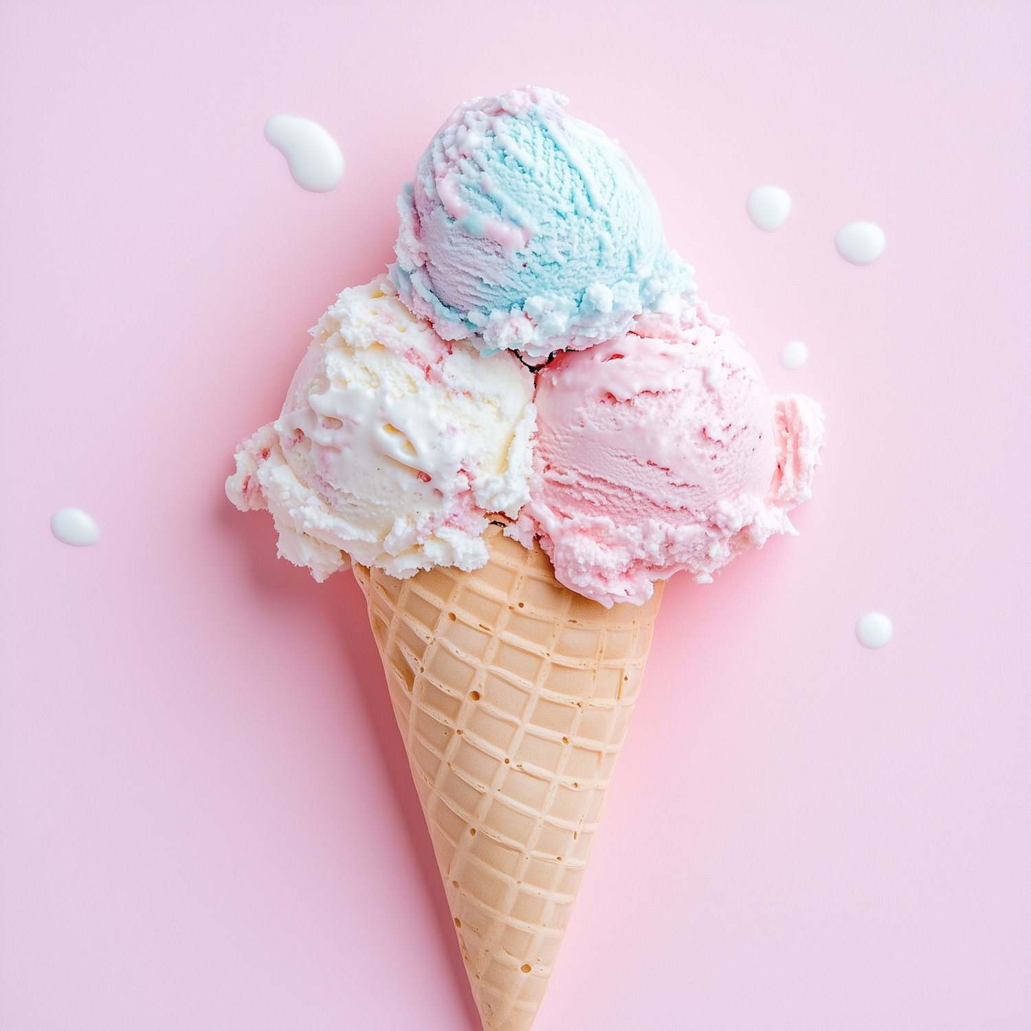 A pastel ice cream cone with blue, white, and pink scoops on a pink background. Perfect for summer vibes and sweet cravings!