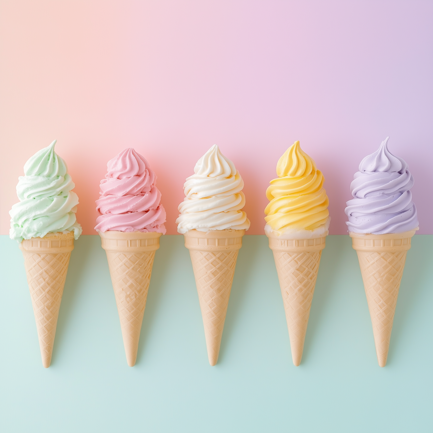 Five colorful soft-serve ice cream cones in pastel shades on a gradient background. Perfect for summer vibes and dessert inspiration.