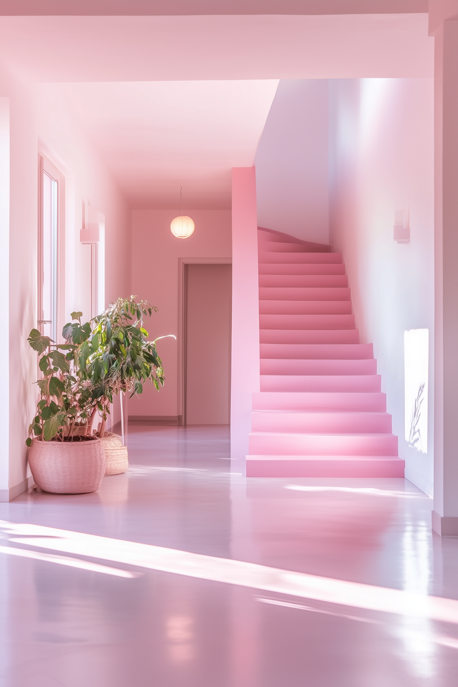 Modern pastel interior with pink staircase, potted plant, and soft natural light creating a serene and minimalistic ambiance.