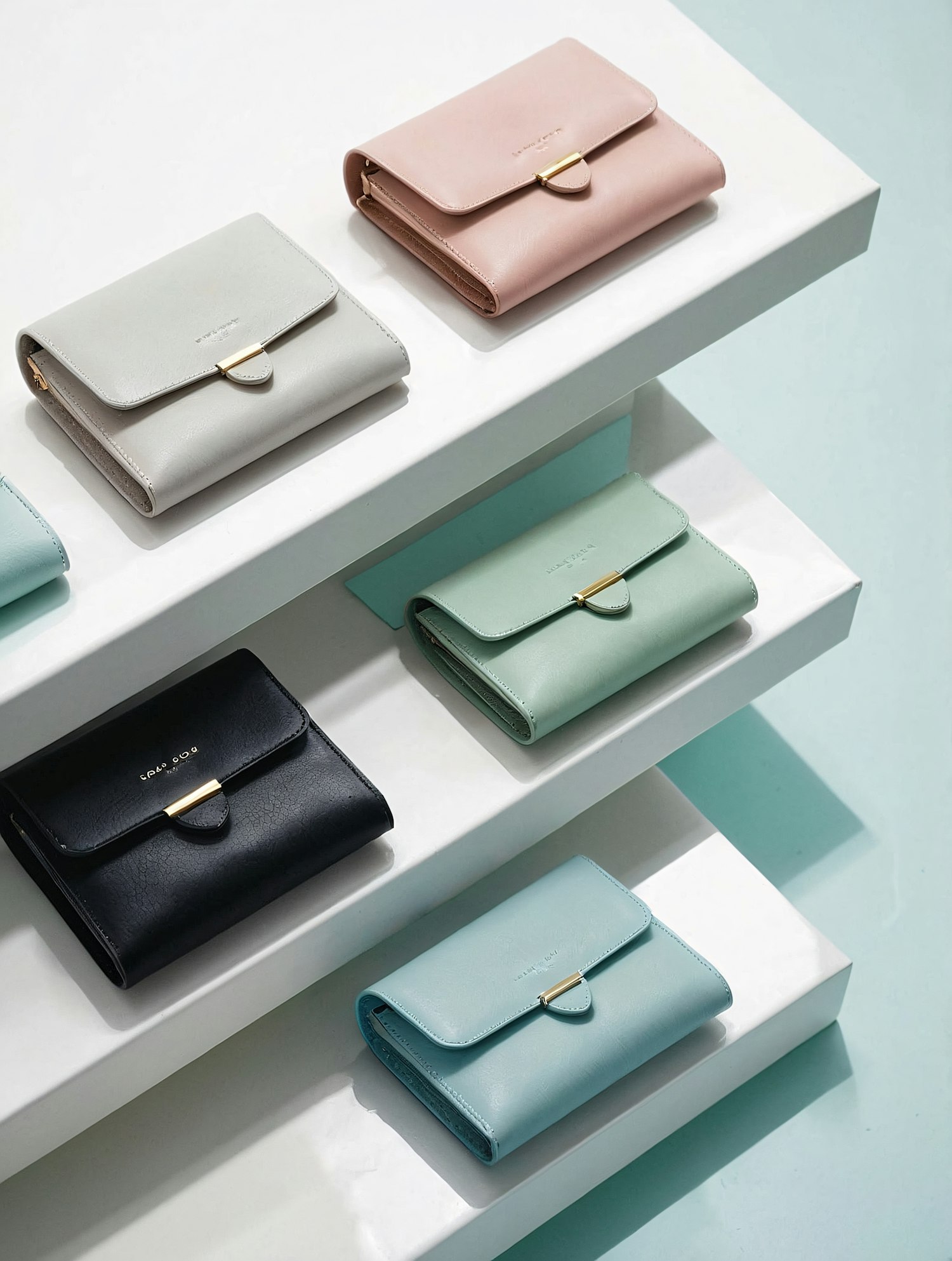 Elegant pastel and neutral wallets with gold clasps displayed on white tiered shelves, perfect for a minimalist aesthetic.