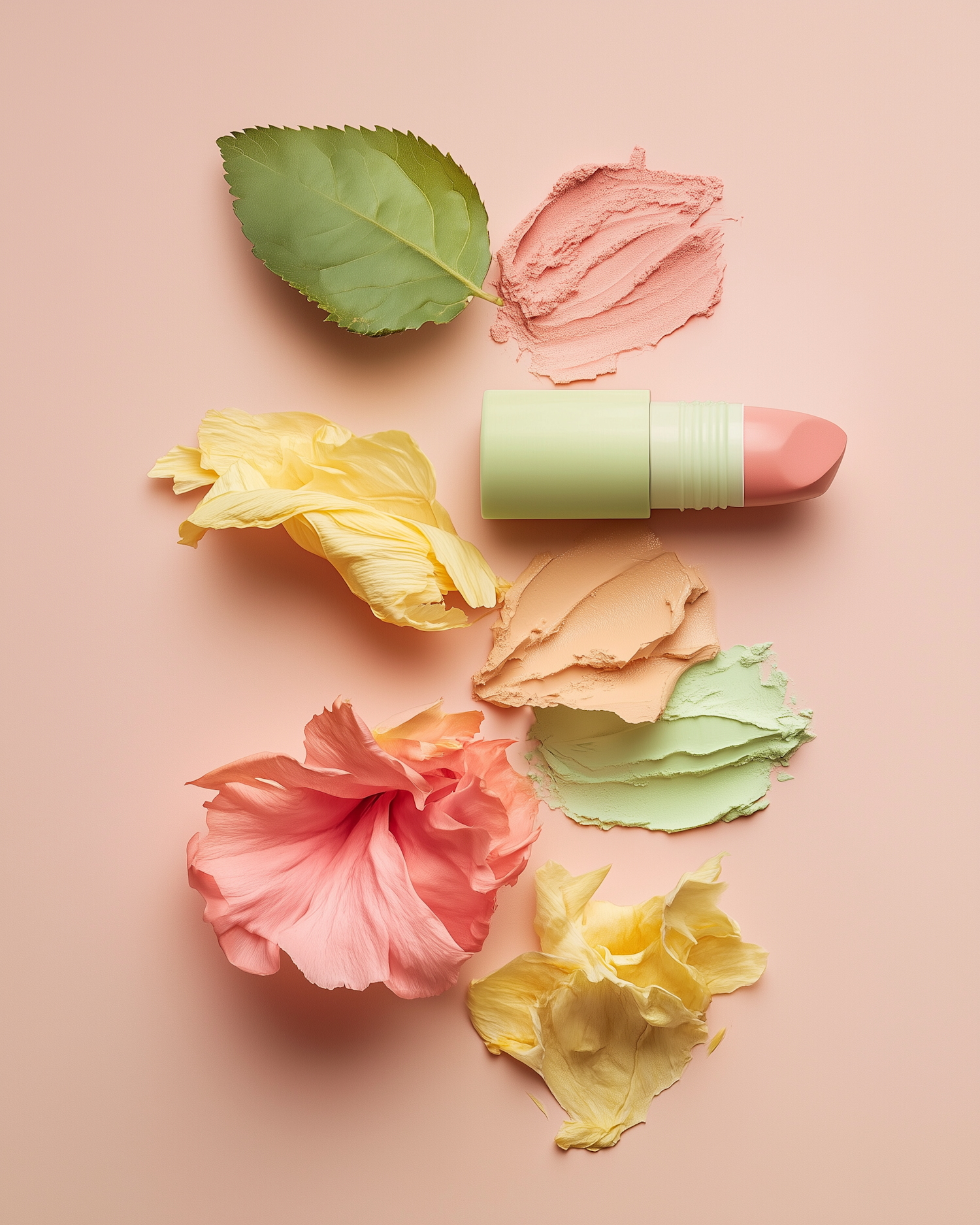 Pastel lipstick and makeup smears with flower petals on a peach background, creating a fresh and vibrant aesthetic.