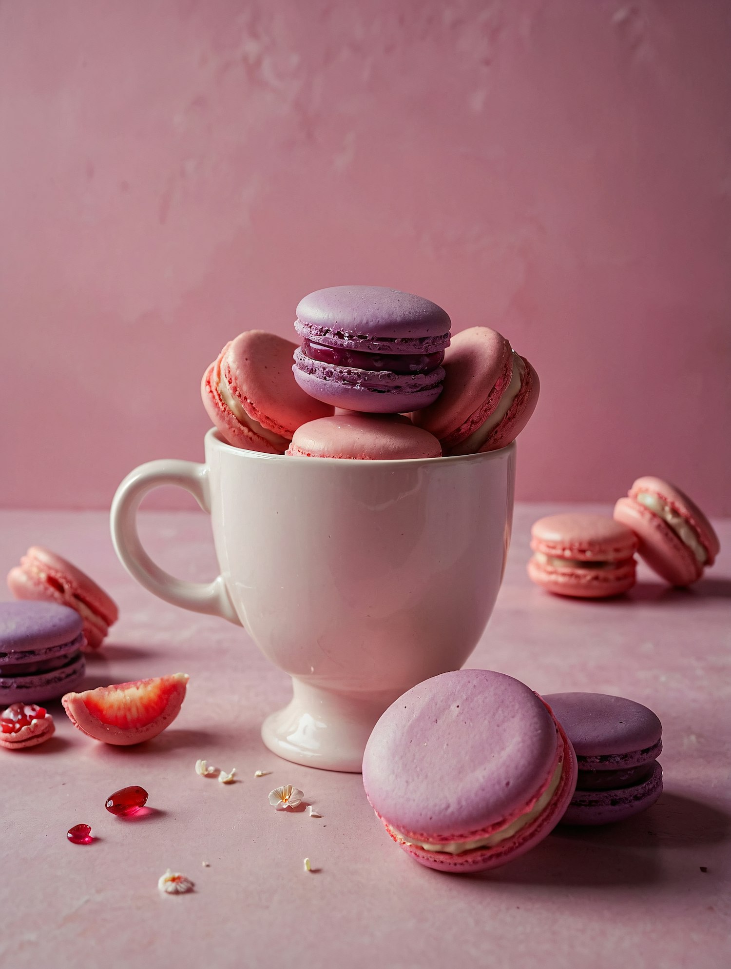 Delicate pink and lavender macarons in a white cup, surrounded by petals and gems on a pastel pink background.