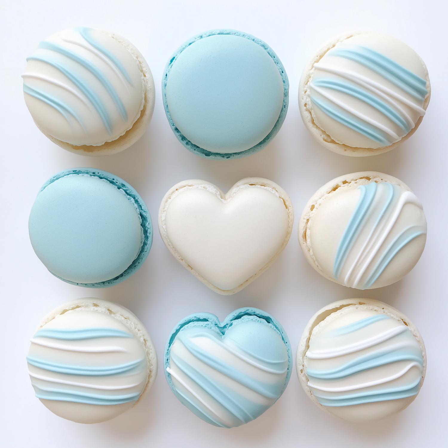 Beautiful pastel blue and white macarons with heart shapes and swirled designs, arranged in a neat grid on a white background.