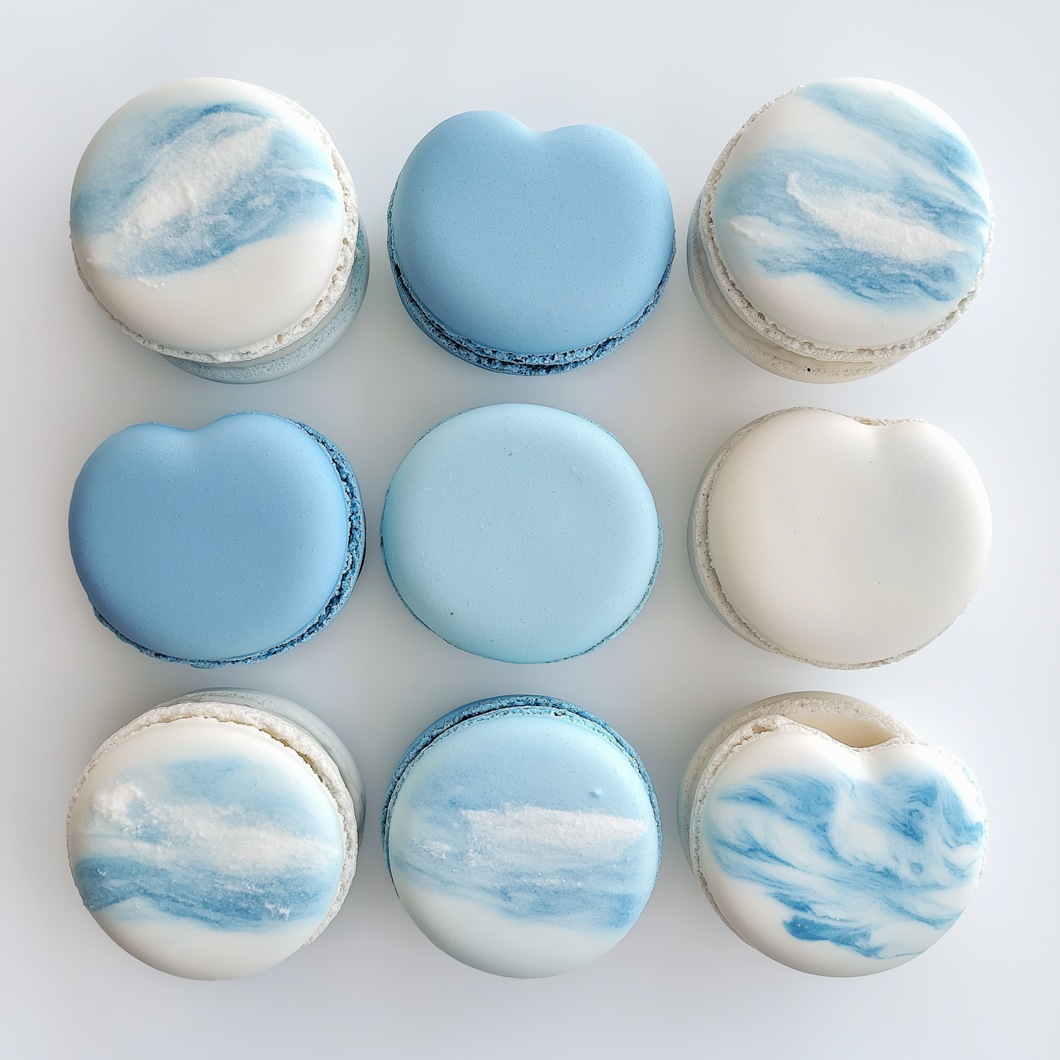 A grid of pastel blue and white macarons with artistic swirls, arranged on a white background for a clean, elegant look.