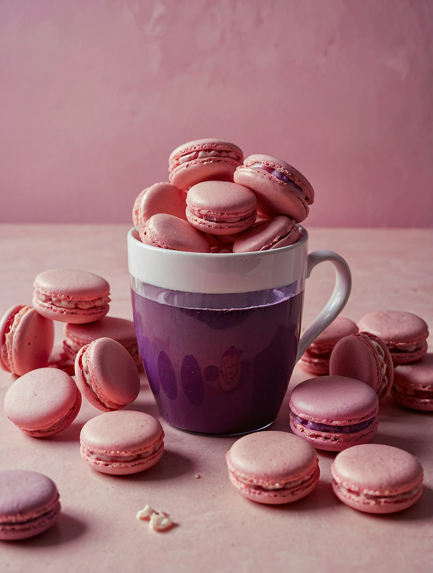 A white mug filled with pink macarons on a pastel pink surface, creating a soft and cozy dessert aesthetic.