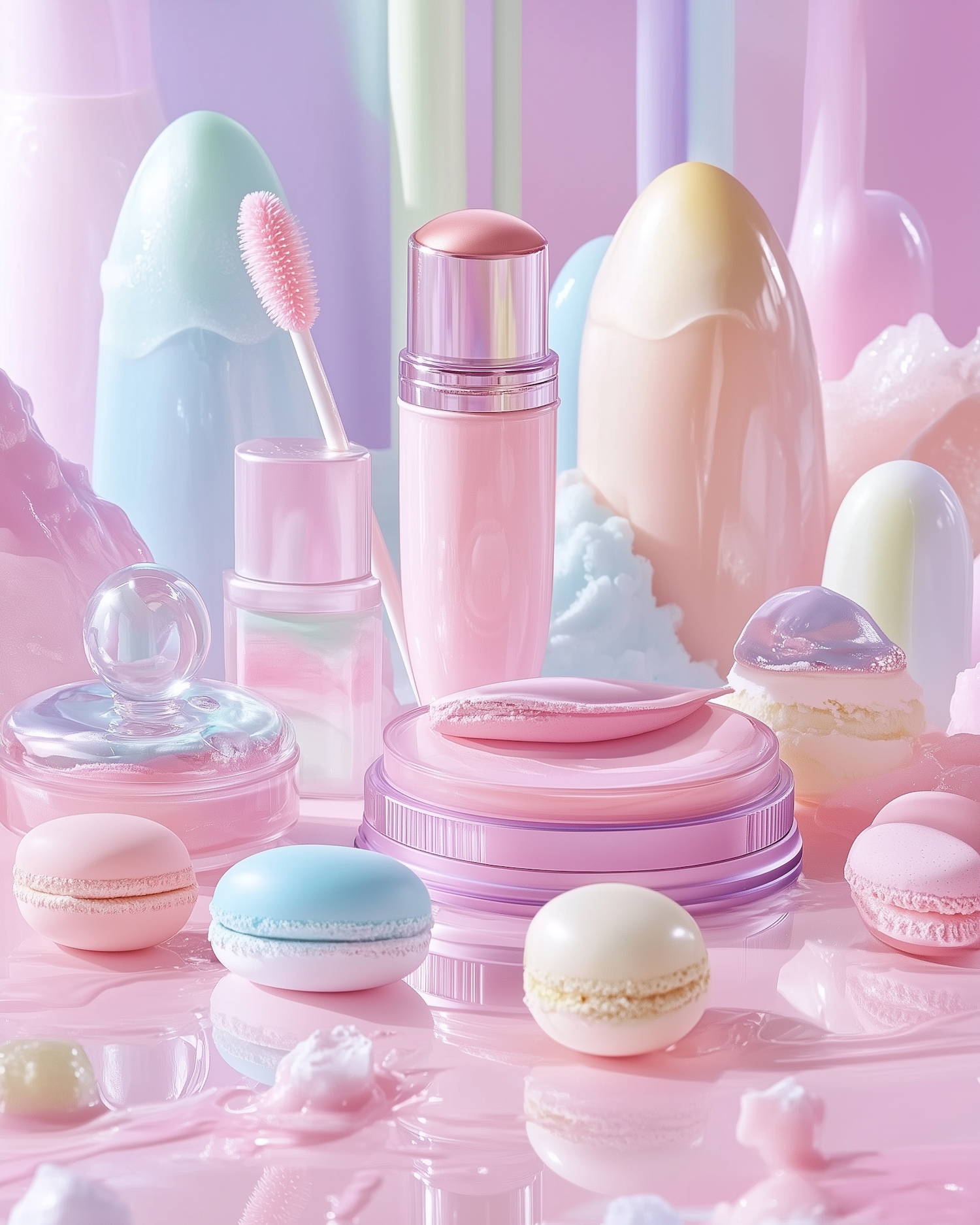 Pastel beauty products and colorful macarons on a glossy pink surface, creating a dreamy and whimsical aesthetic.