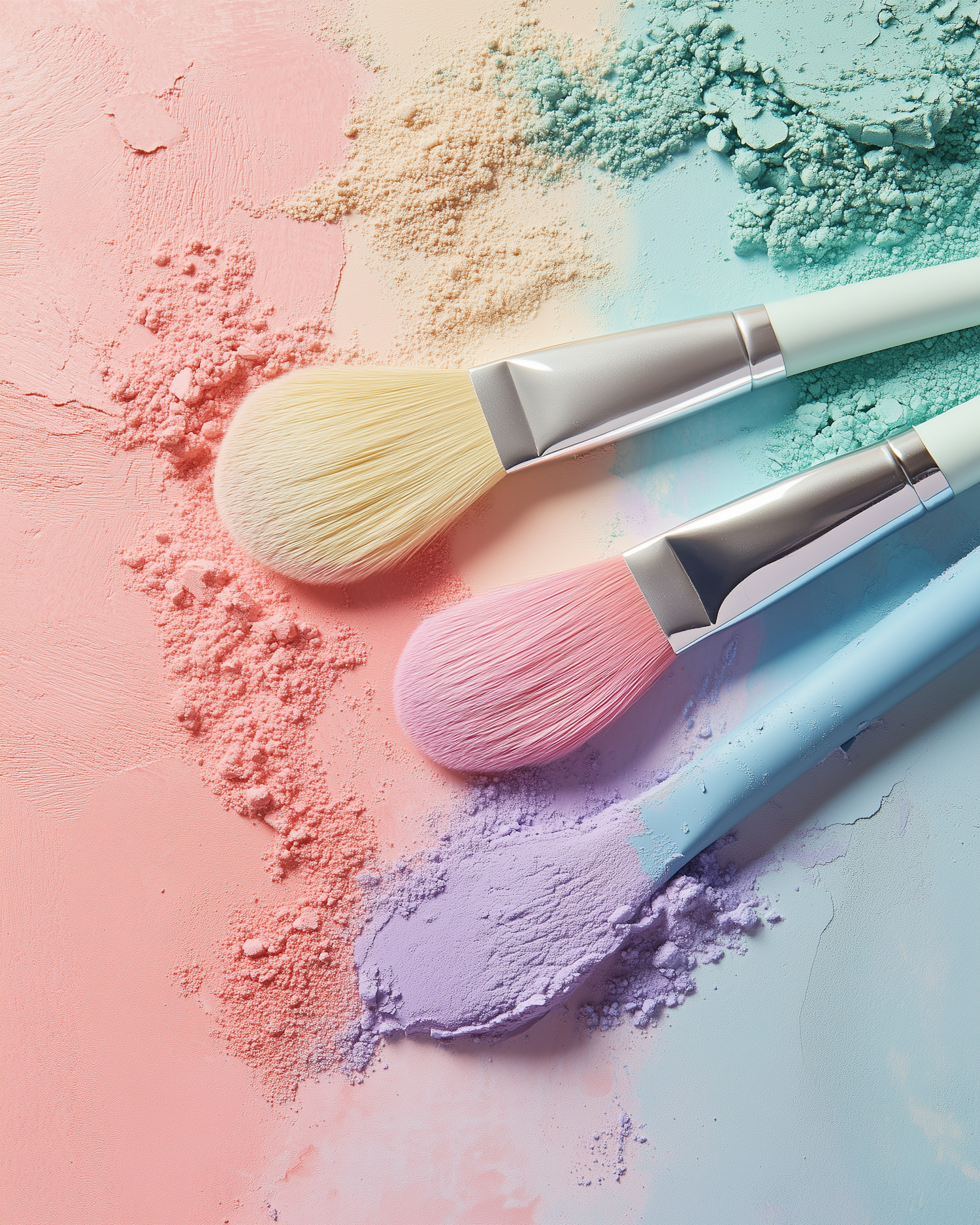 Pastel makeup brushes on colorful powder create a soothing, artistic scene with soft hues of yellow, pink, and lavender.
