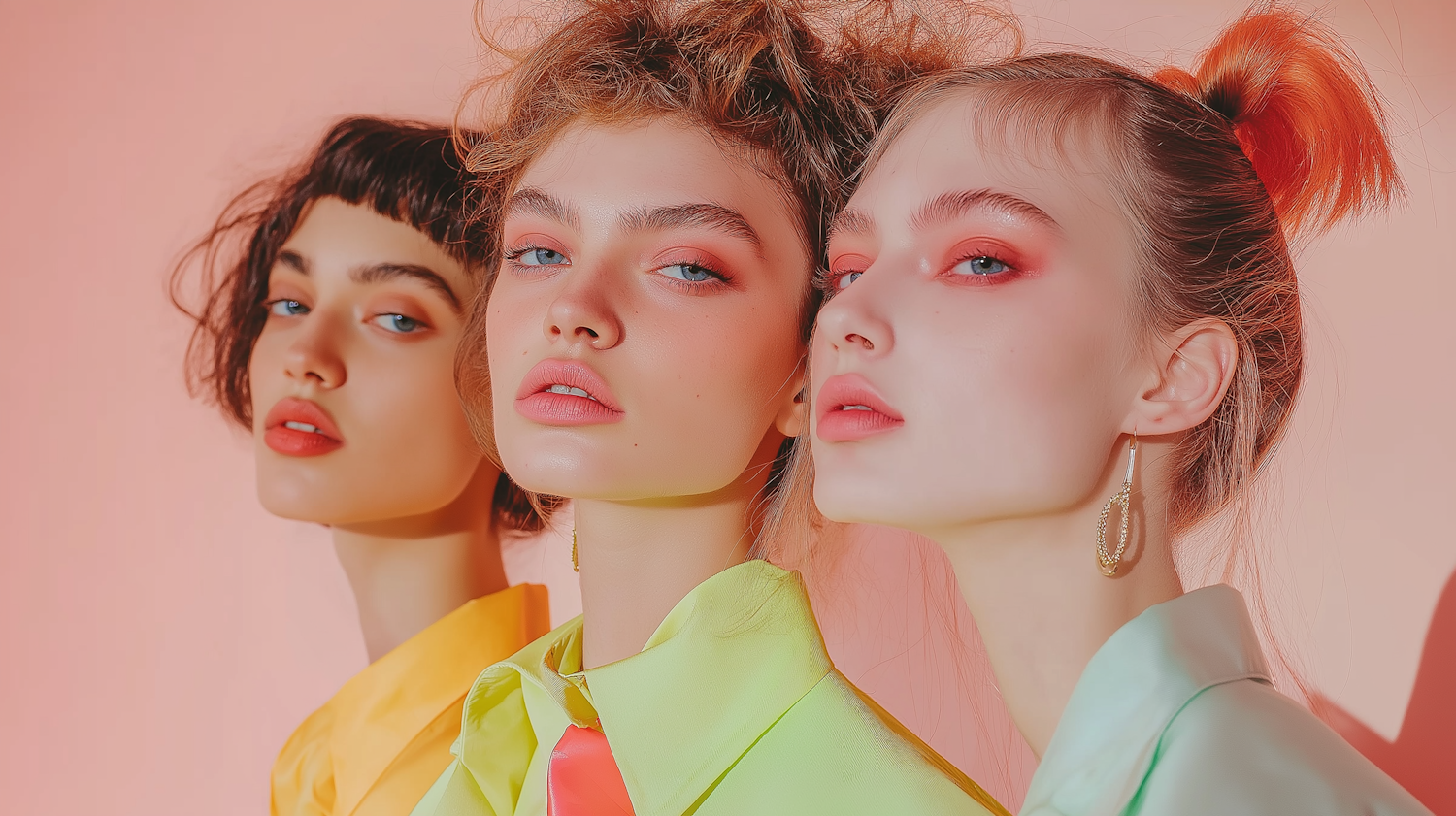 Three stylish women with bold makeup and pastel outfits pose against a pink background, showcasing vibrant fashion and beauty trends.