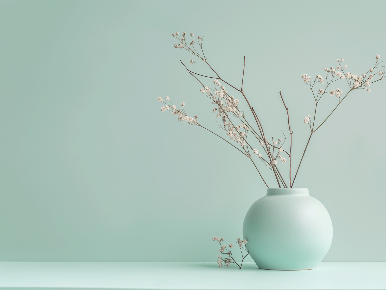 Minimalist mint green vase with delicate dried flowers against a matching background, creating a serene and elegant scene.