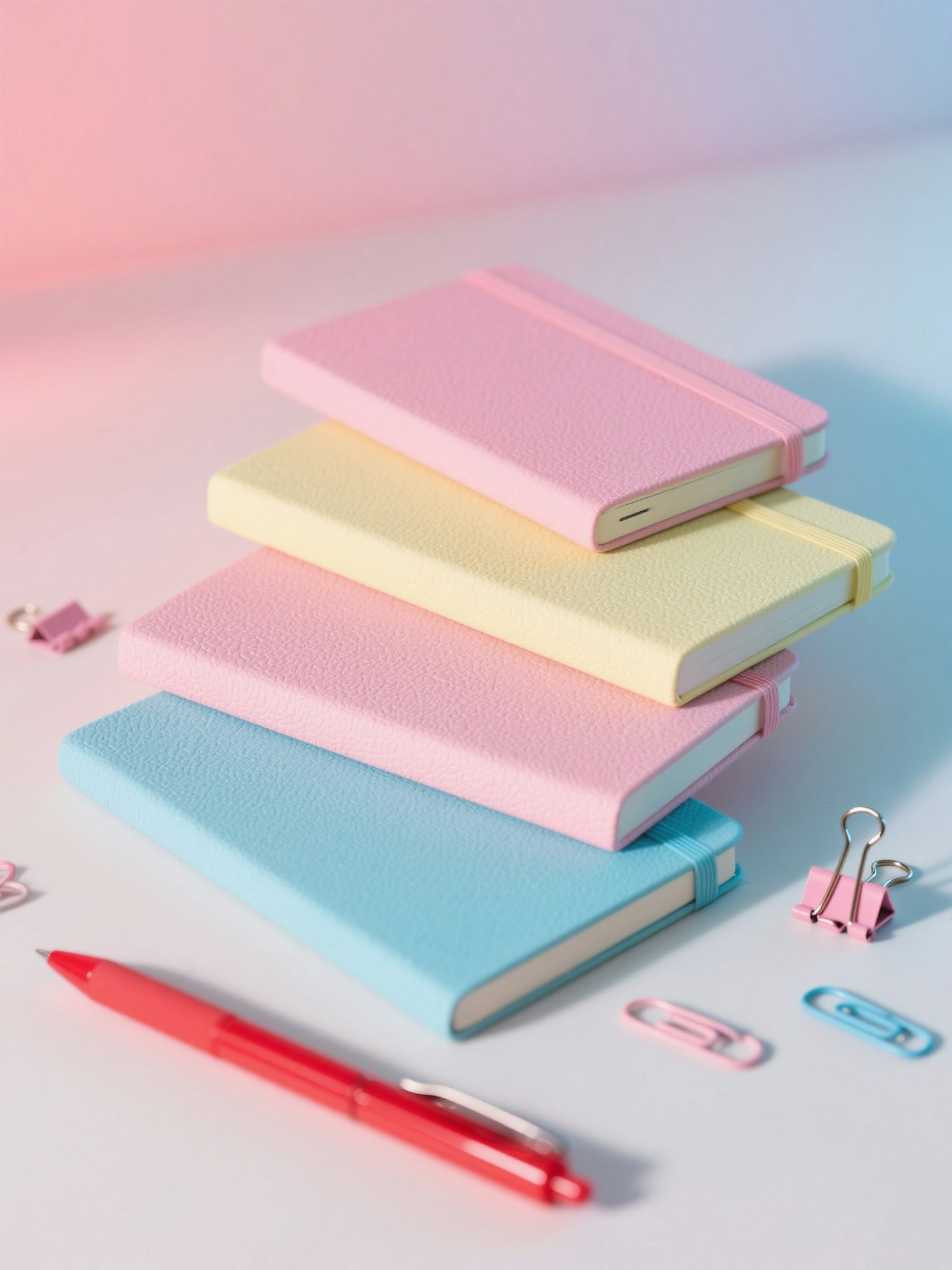 Pastel notebooks stacked with matching office supplies on a white surface, featuring a soft pink and blue gradient background.