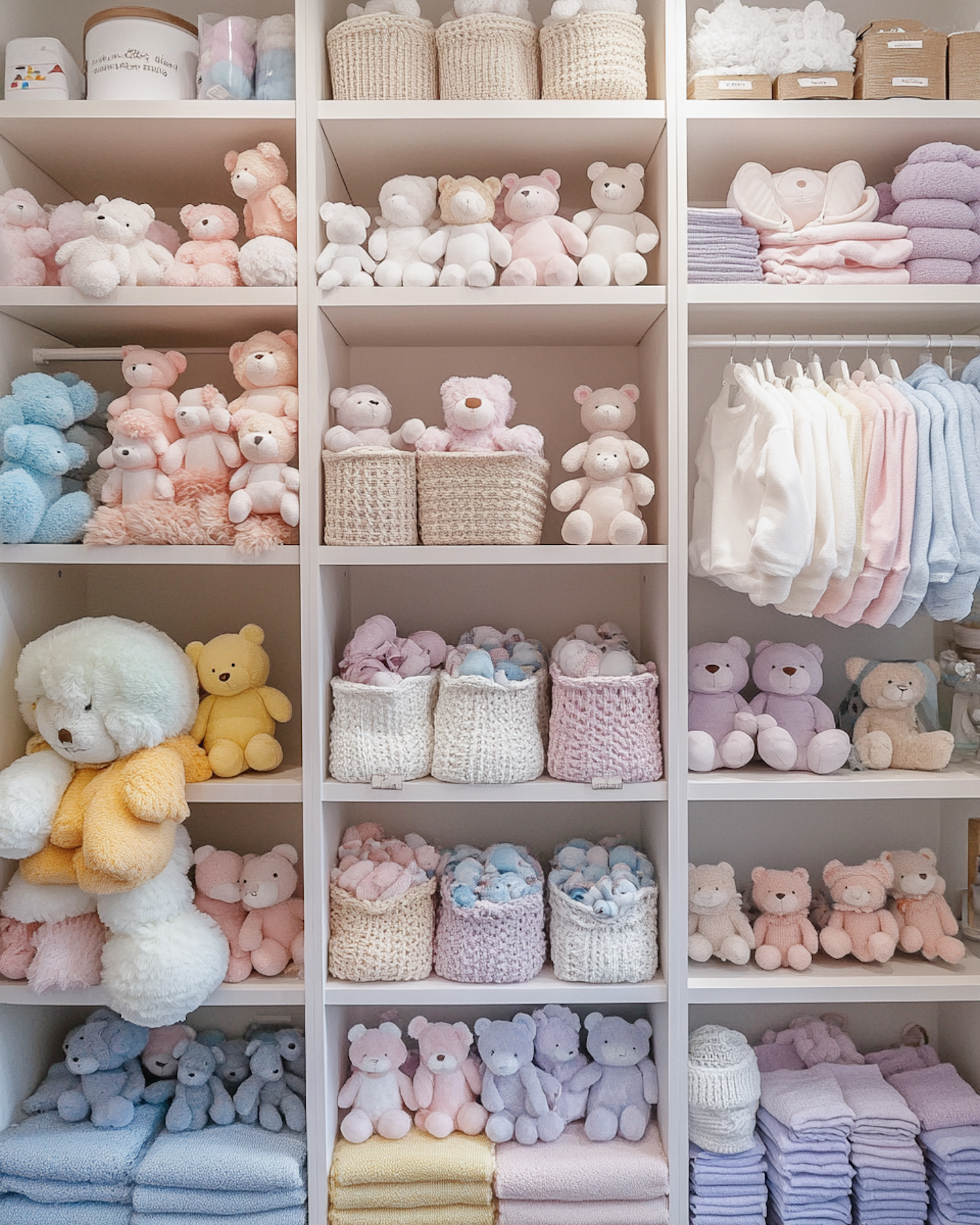 Pastel-colored plush toys and baby clothes neatly arranged on shelves, creating a cozy and inviting display.