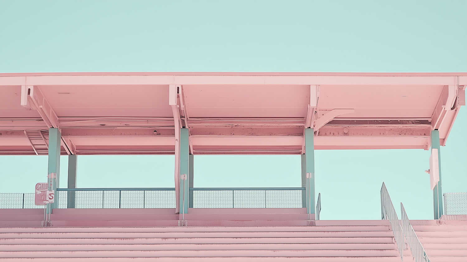 Minimalist pastel architectural scene with pink seating and mint green beams under a bright blue sky.
