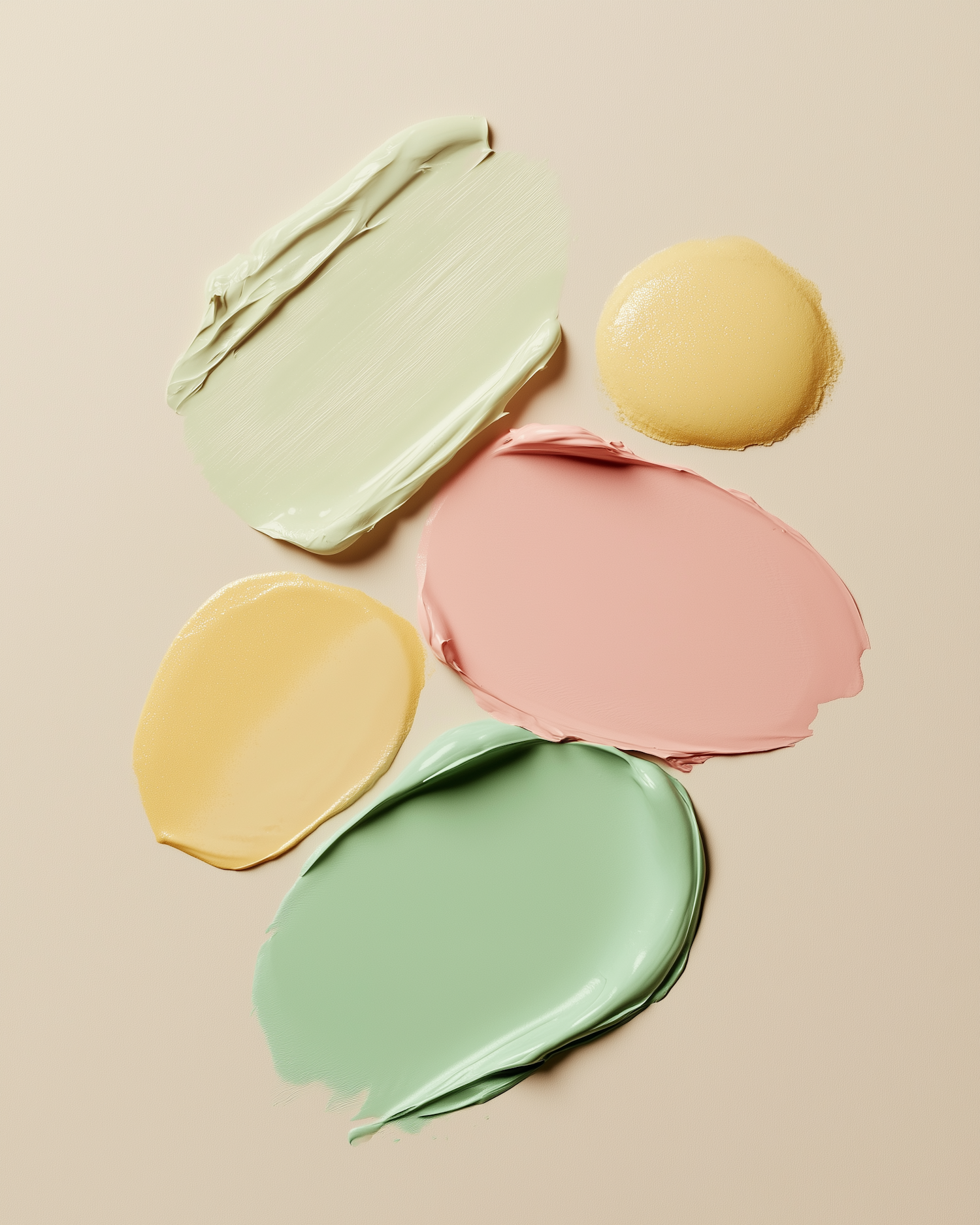 Pastel paint swatches on a beige background, featuring mint green, pale yellow, and light pink hues with a creamy texture.