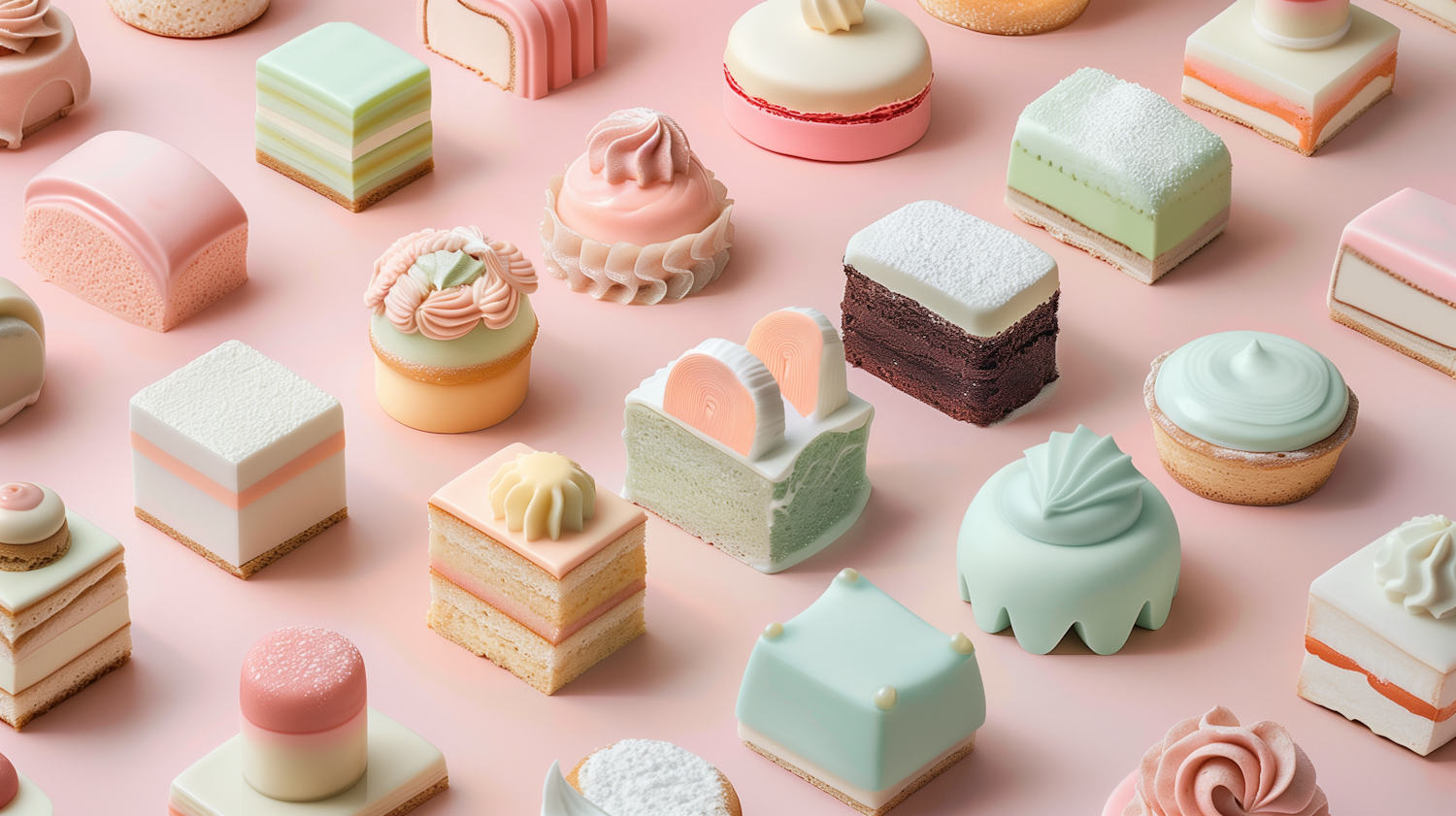 Elegant pastel pastries arranged on a pink background, featuring intricate icing and decorative toppings in soft pinks and greens.
