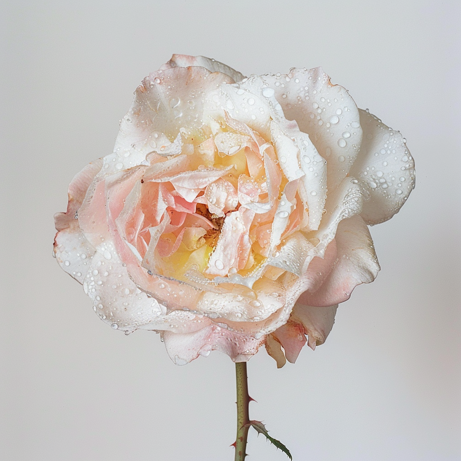 Close-up of a dewy pink and white rose with water droplets on petals, set against a light gray background.