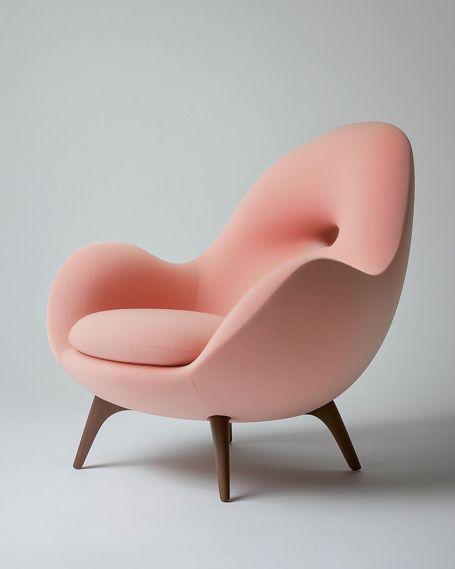 Elegant pastel pink armchair with curvy design and wooden legs, perfect for adding a modern touch to any living space.