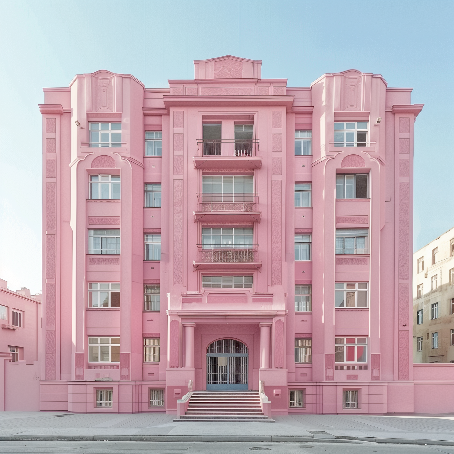 A pastel pink art deco building with intricate details, arched windows, and balconies, set against a clear blue sky.