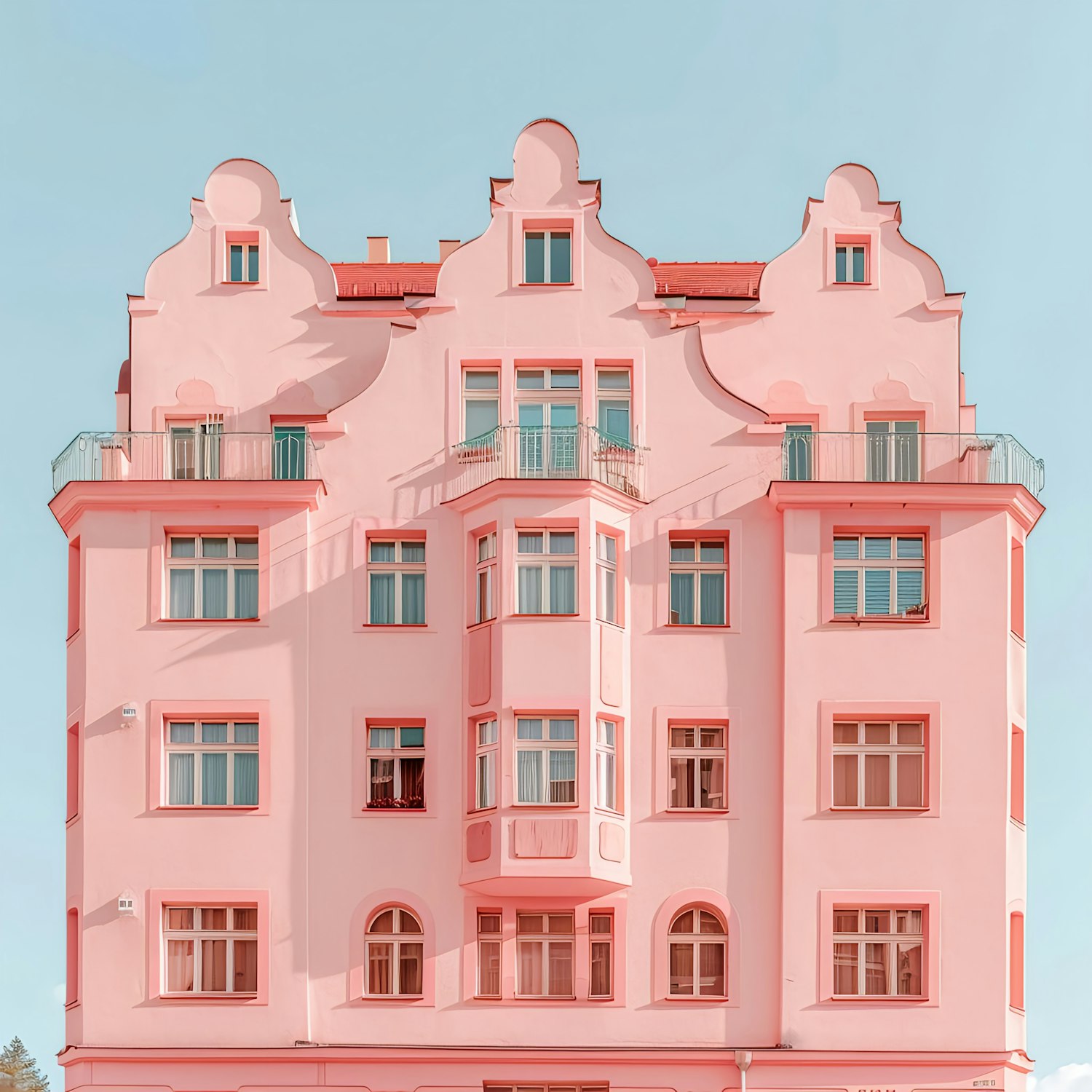Charming pastel pink building with ornate gables and large windows against a clear blue sky, exuding elegance and nostalgia.