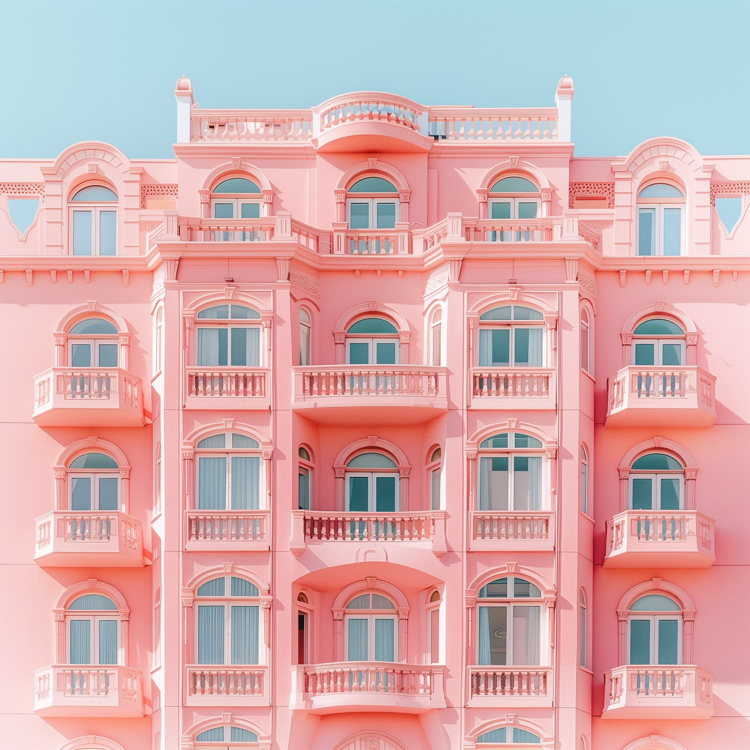 Pastel pink building with arched windows and balconies against a clear blue sky, showcasing elegant architectural details.