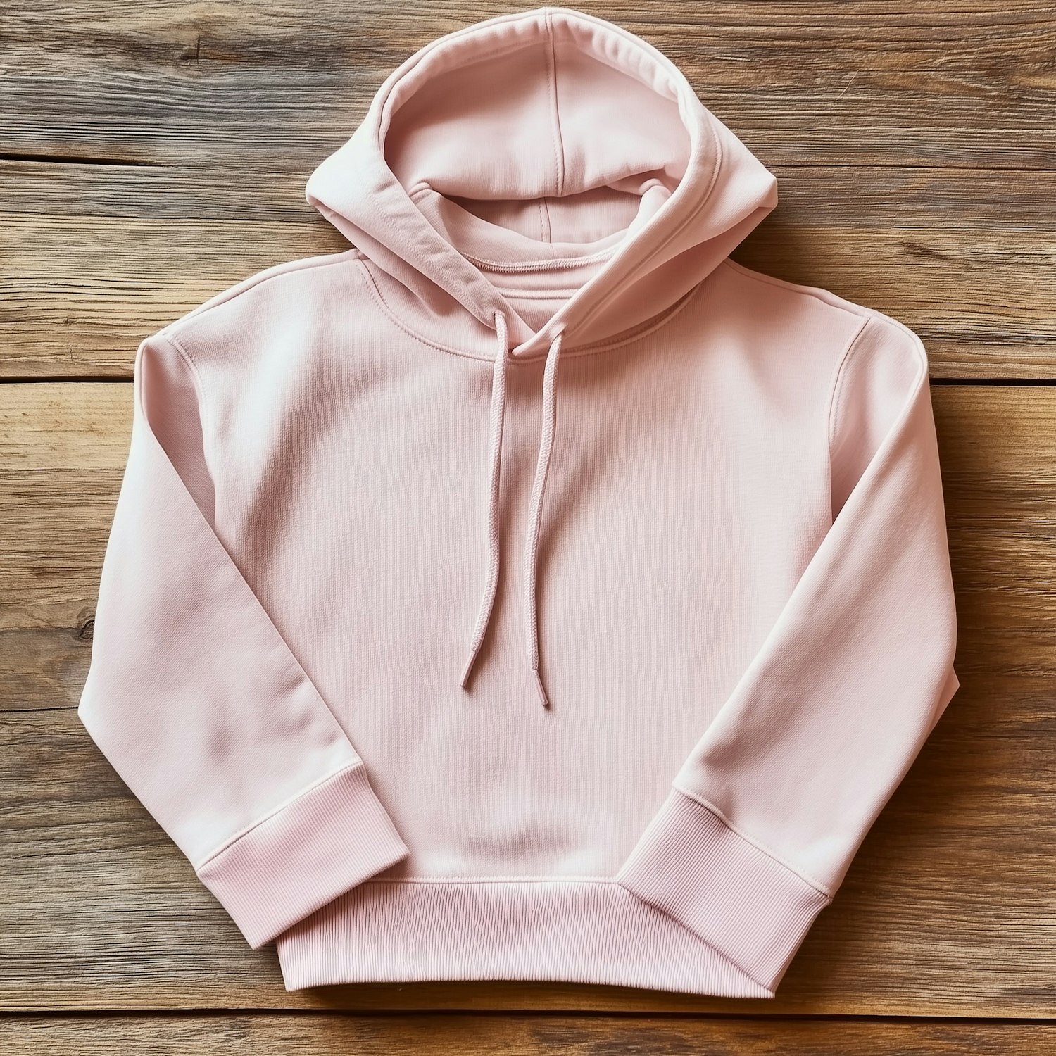 Soft pastel pink hoodie with a drawstring hood and ribbed cuffs, styled on a rustic wooden surface for a cozy, minimalist vibe.