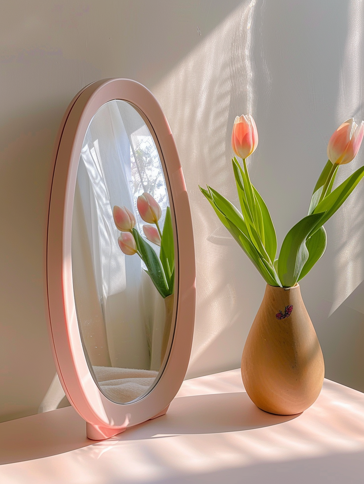 Elegant wooden vase with pink tulips beside a pink-framed mirror, reflecting soft natural light and creating a serene ambiance.