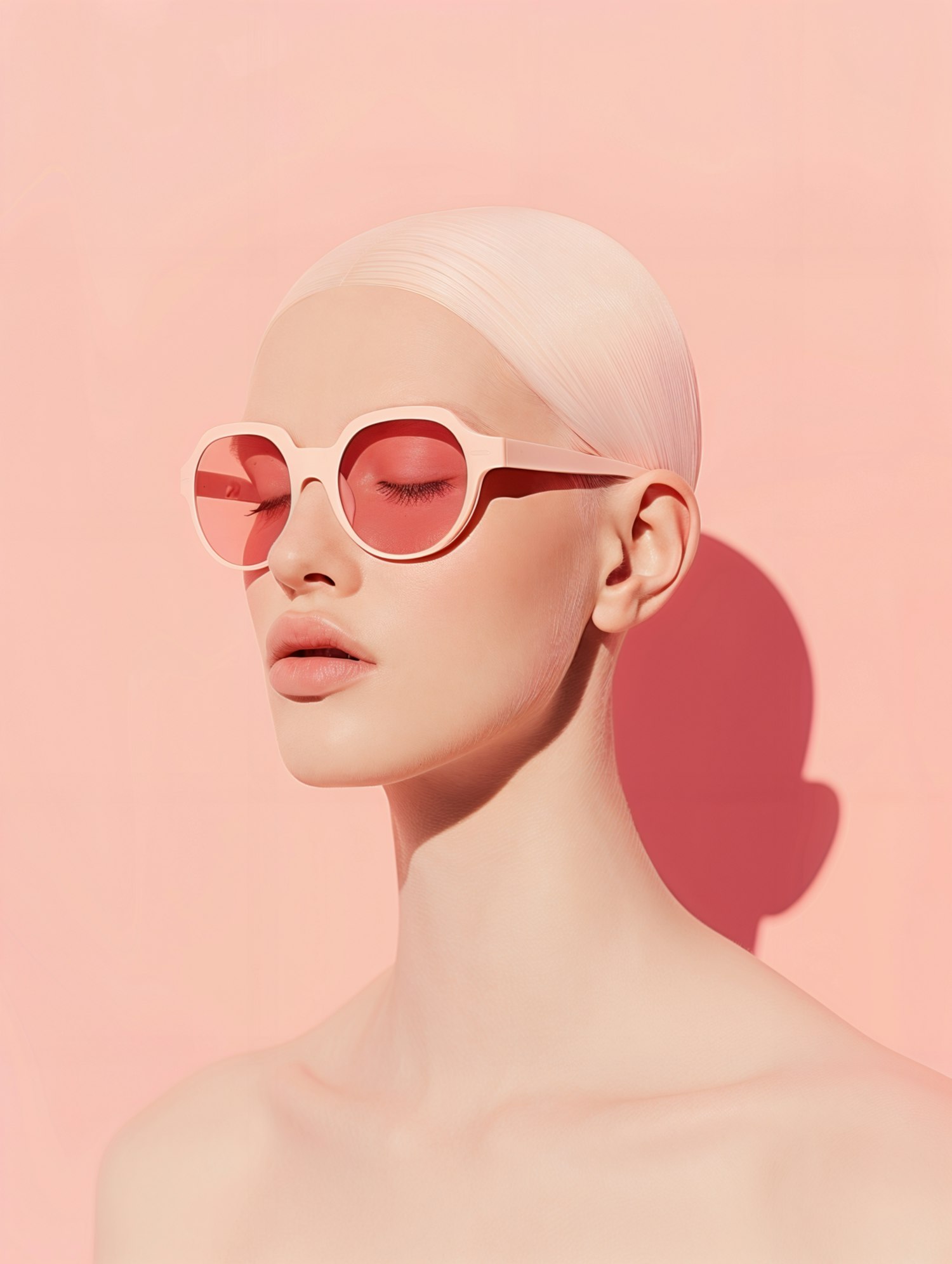 Minimalist portrait with pink sunglasses and pastel tones, featuring a serene expression and soft lighting.