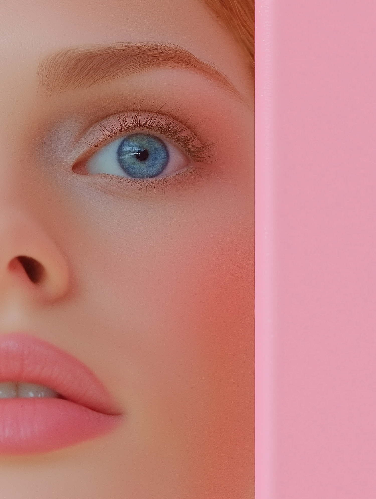 Close-up of a woman's face with blue eyes, pink lips, and a pastel pink background, creating a soft and minimalistic aesthetic.