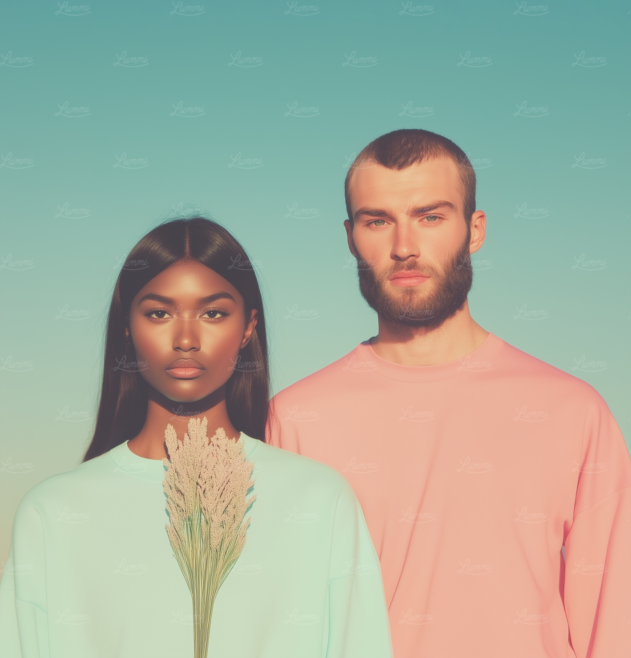 A serene portrait of two individuals in pastel outfits against a clear blue sky, holding dried wheat for a minimalist aesthetic.