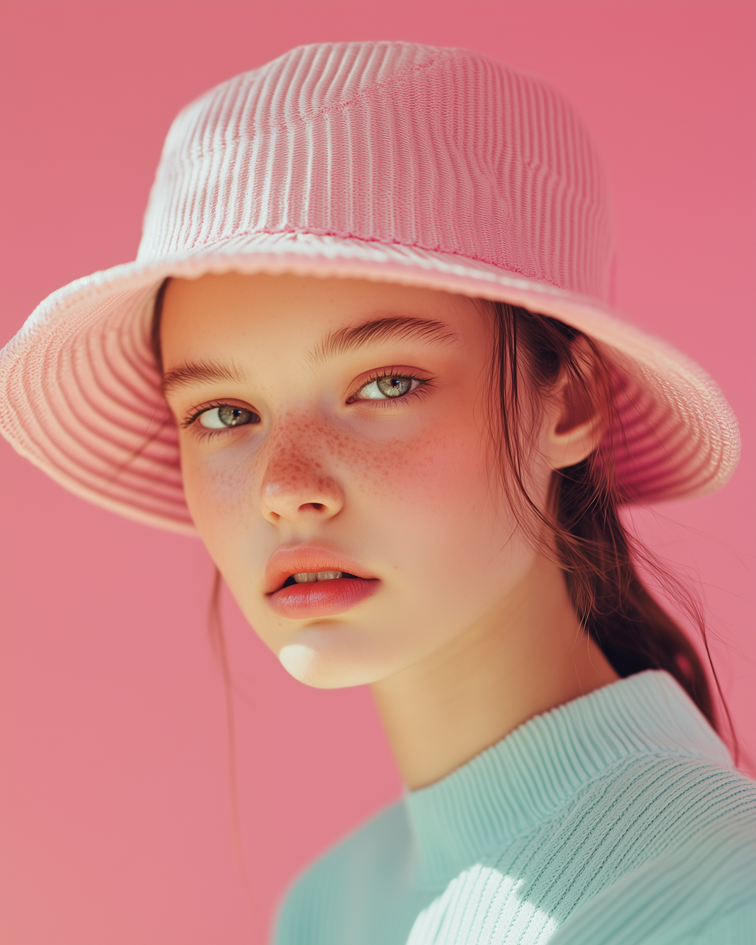 Young girl in a pink bucket hat and blue sweater against a pastel pink background, showcasing a serene and harmonious color palette.
