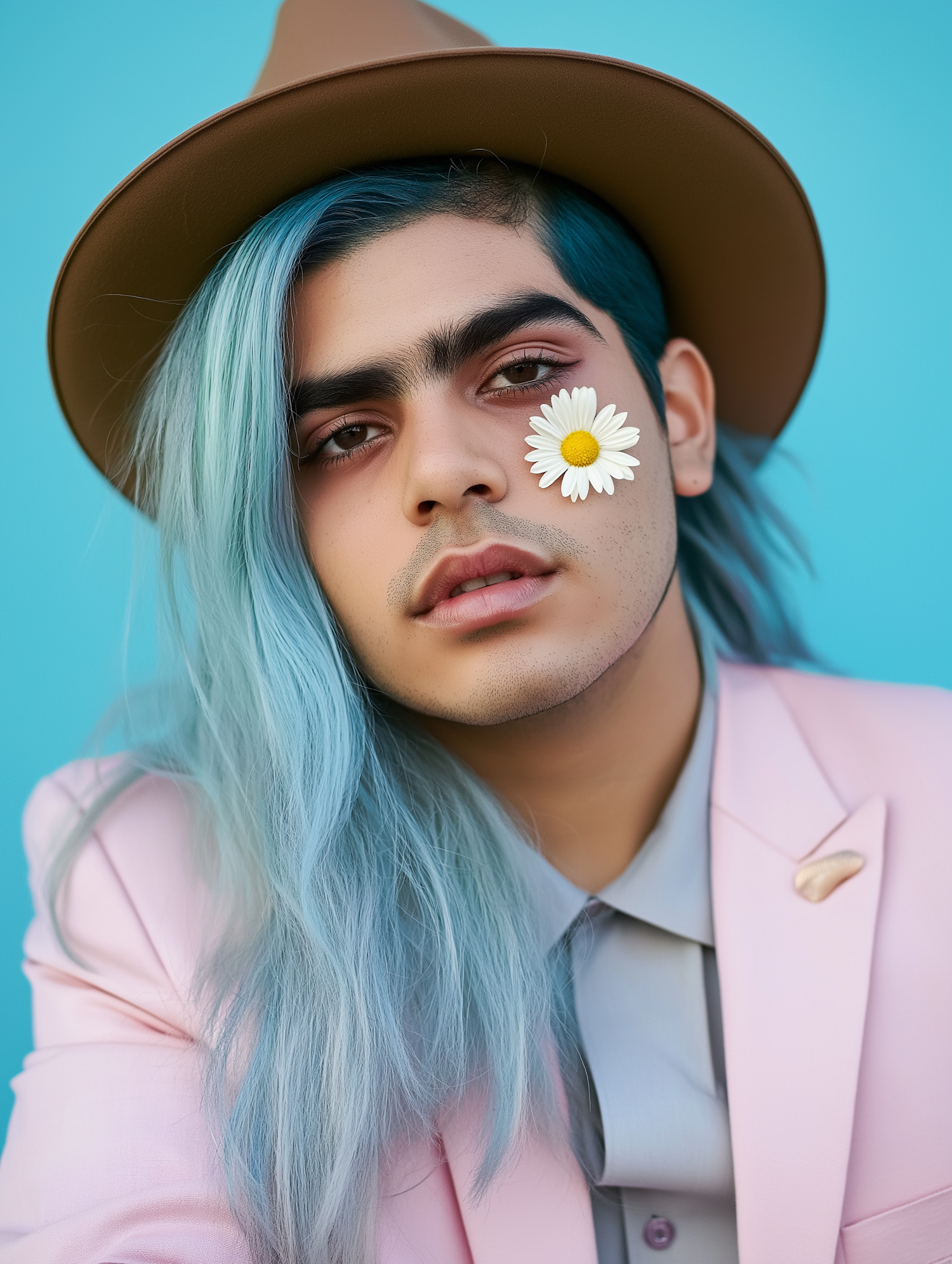 Stylish portrait of a person with pastel blue hair, a pink blazer, and a daisy on their cheek, set against a vibrant blue background.