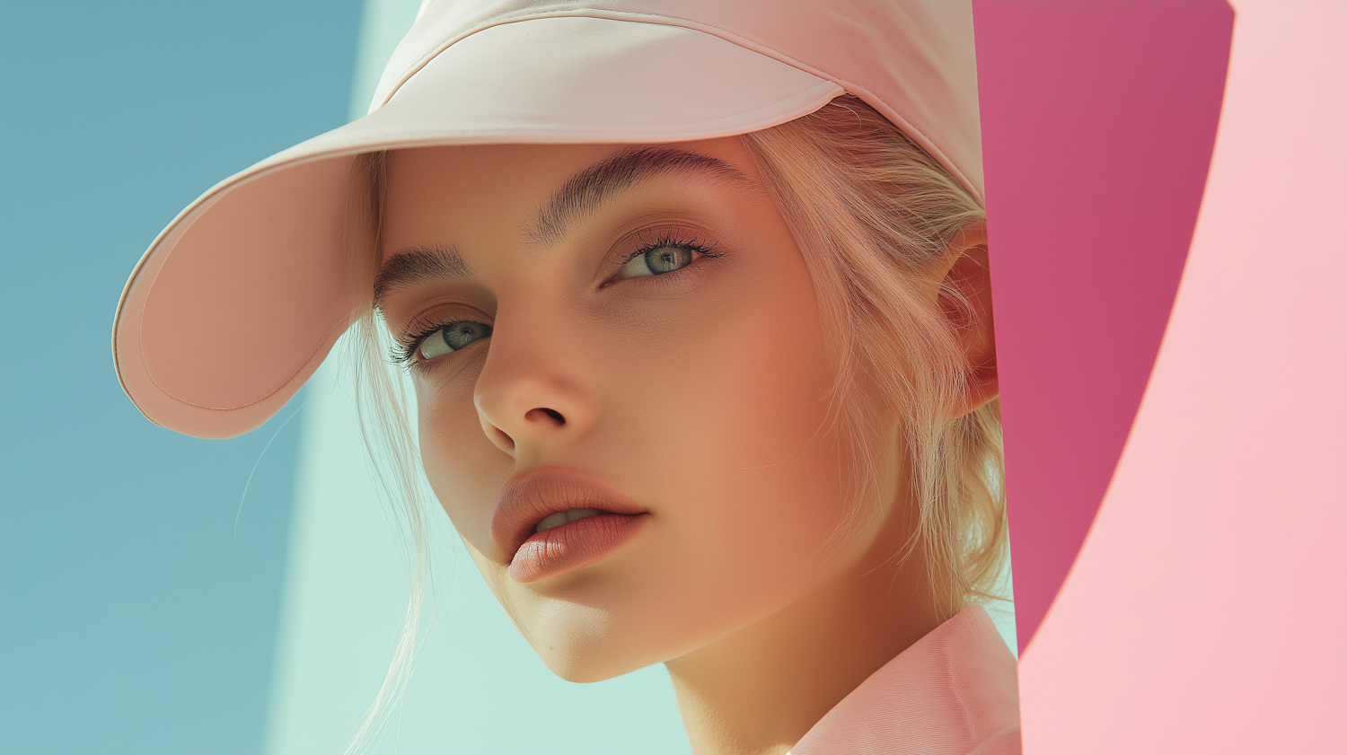 Close-up of a blonde woman in a pastel pink cap and shirt, set against a vibrant blue and pink background. Bright, modern aesthetic.