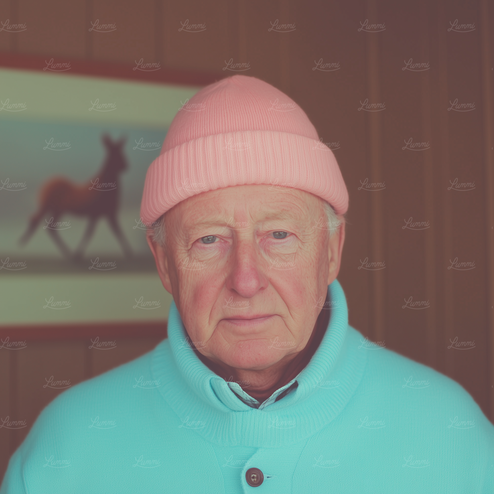 Elderly man in a pastel pink beanie and turquoise sweater, standing against a wooden wall with a horse painting in the background.