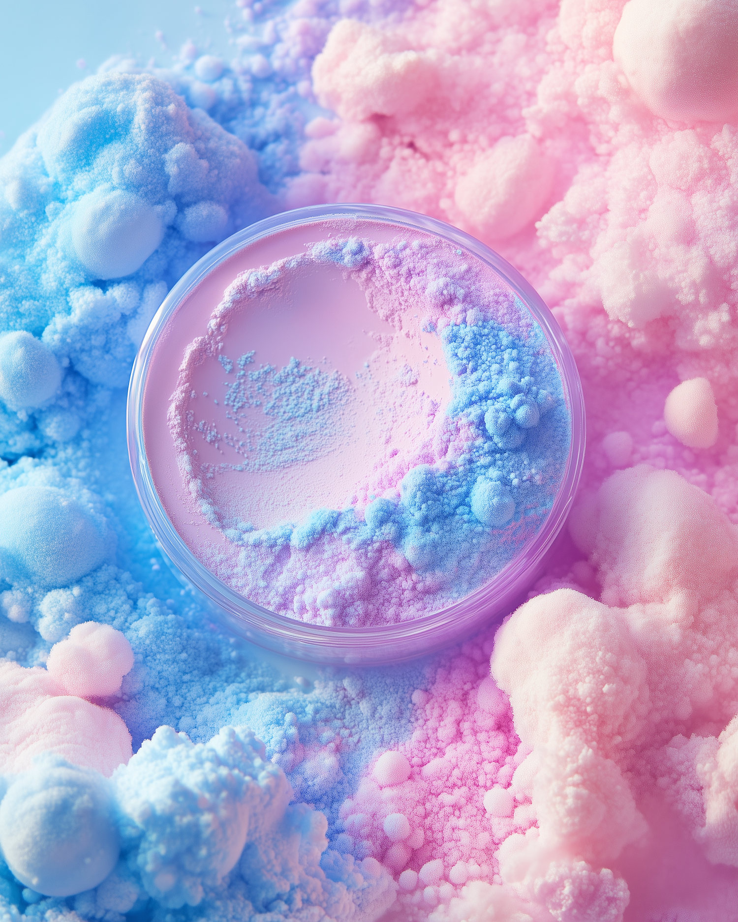 Pastel pink and blue powder in a circular container, spilling out in fluffy formations, creating a dreamy, cotton candy-like appearance.