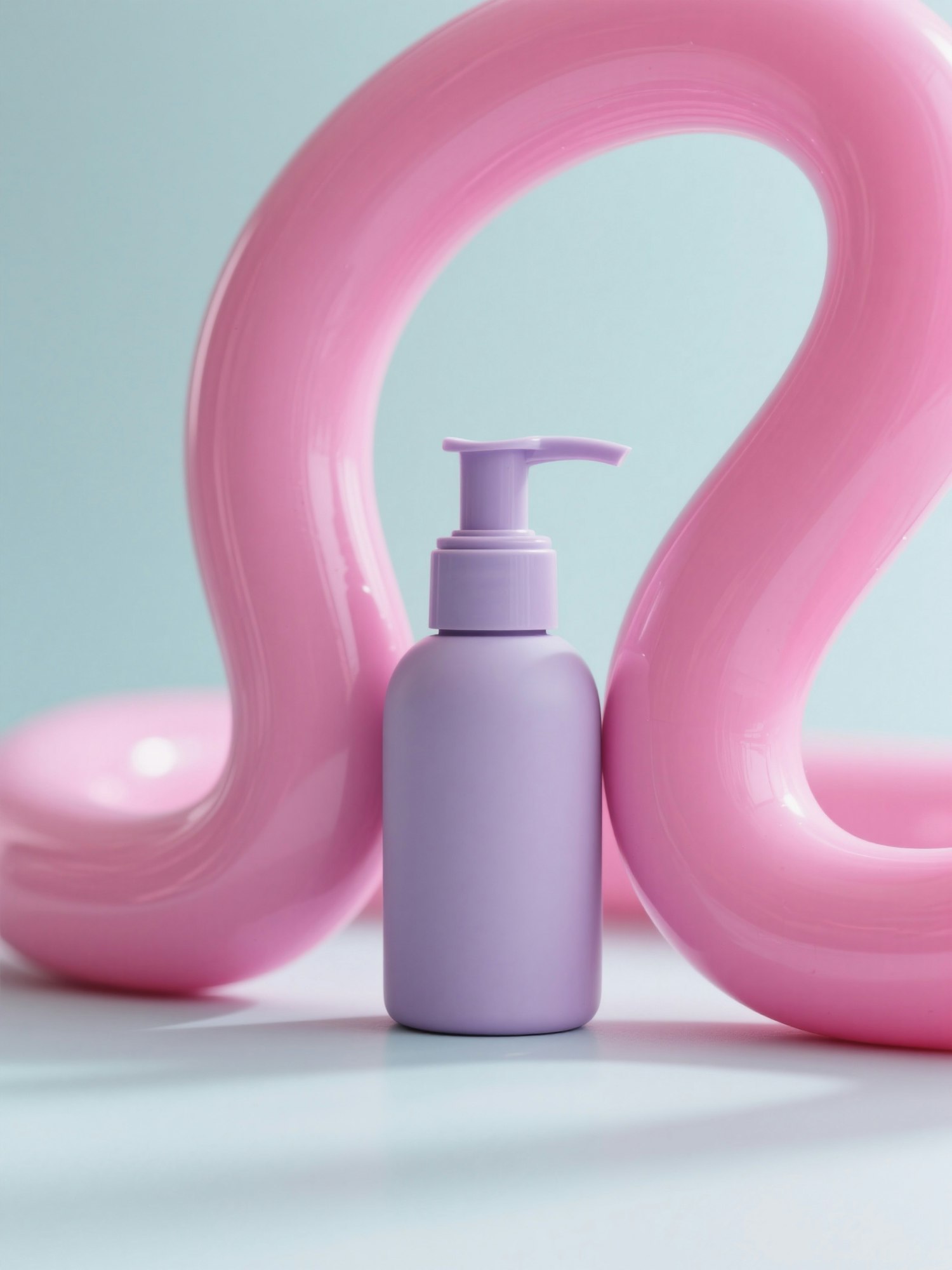 Minimalist pastel purple pump bottle framed by a glossy pink abstract loop on a soft blue background, creating a modern aesthetic.