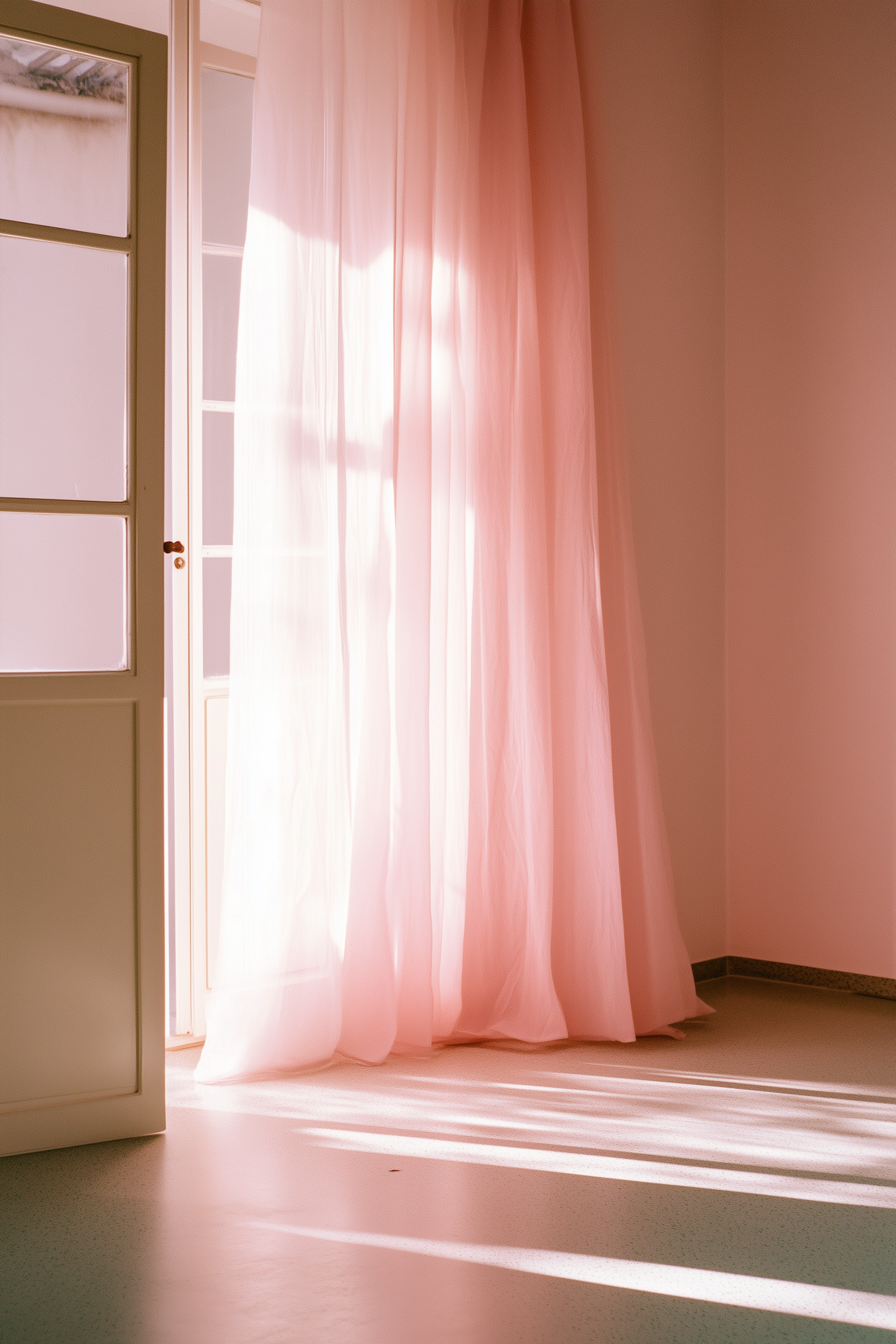 Sunlight filters through a pink sheer curtain in a pastel-toned room, creating a serene and warm ambiance with soft shadows.