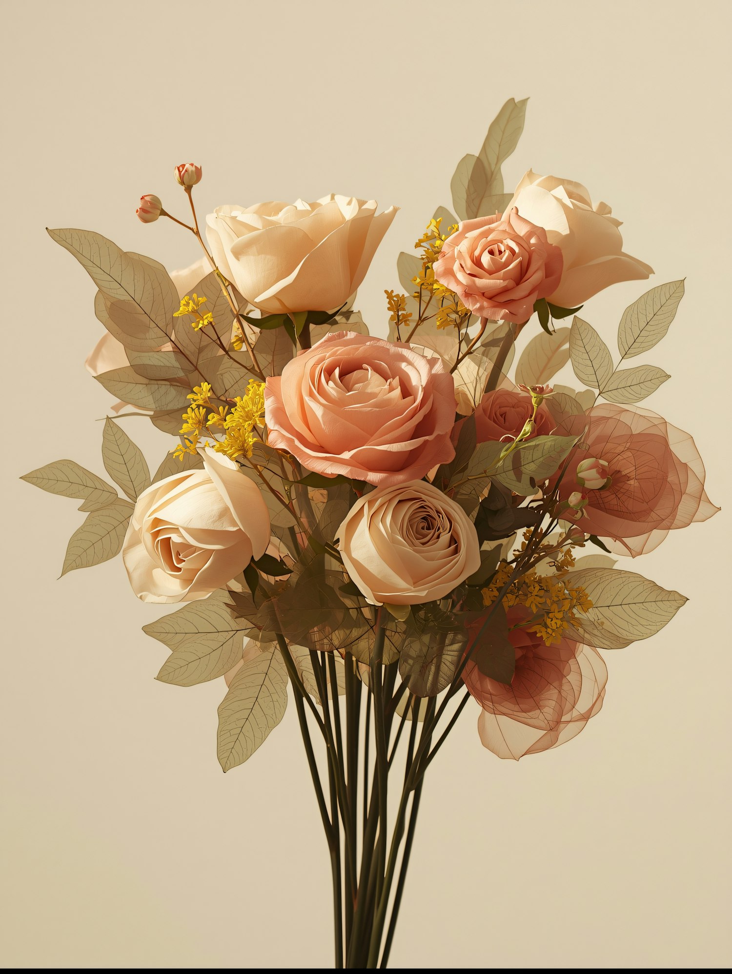 A delicate bouquet of pastel roses with green leaves and yellow accents, set against a neutral background for a serene and elegant look.