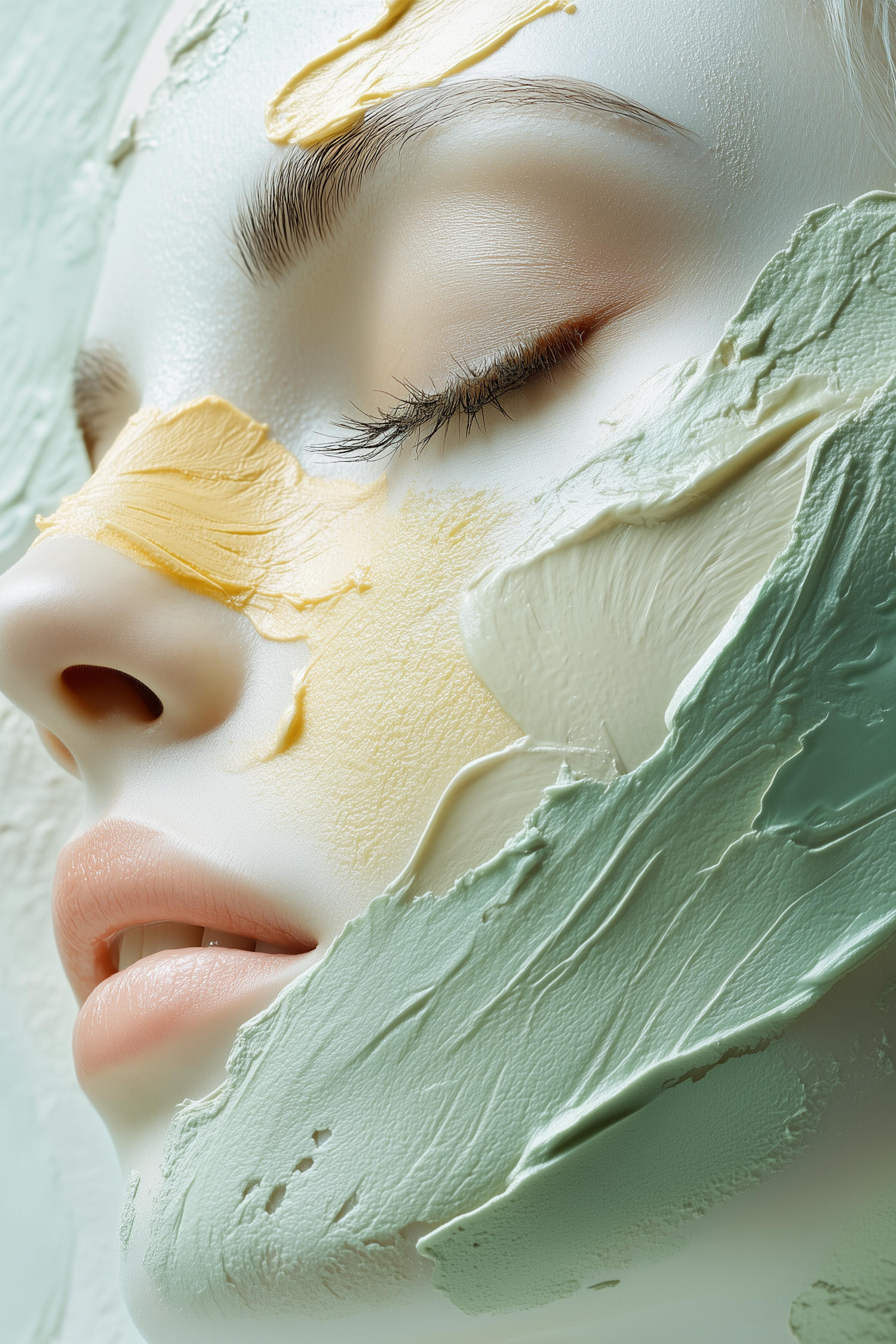 Close-up of a serene face with pastel facial masks, highlighting skincare and relaxation.
