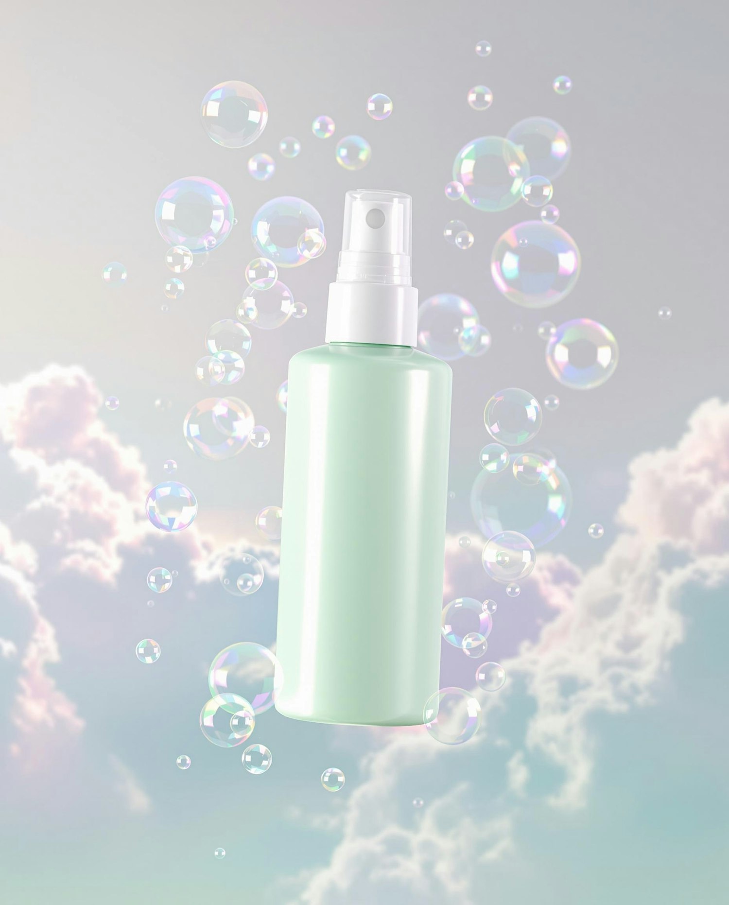 Pastel green spray bottle surrounded by glowing soap bubbles and a cloudy pastel sky, creating a dreamy, clean aesthetic.