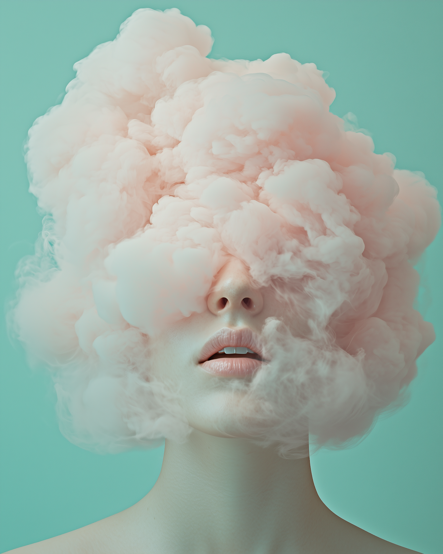 A surreal portrait of a person with pastel pink smoke obscuring their face, set against a teal background. Dreamy and artistic vibes.
