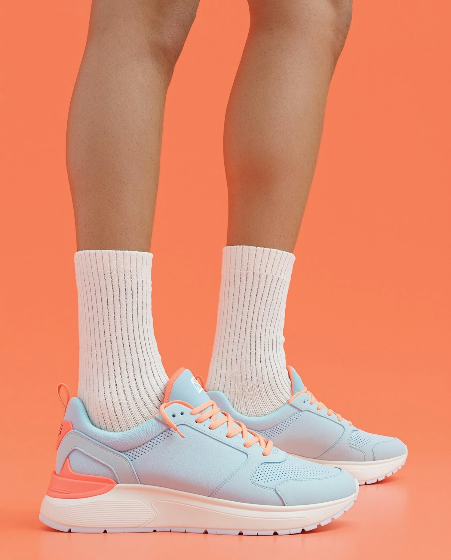 A studio fashion photoshoot with soft diffused lighting, vibrant monochrome background, high contrast between subject and backdrop, focus on sneakers and socks styled together, clean composition, pastel or bold pop colors, professional product photography style — close-up side view of light blue sneakers with neon orange accents, worn with white ribbed socks, soft orange background